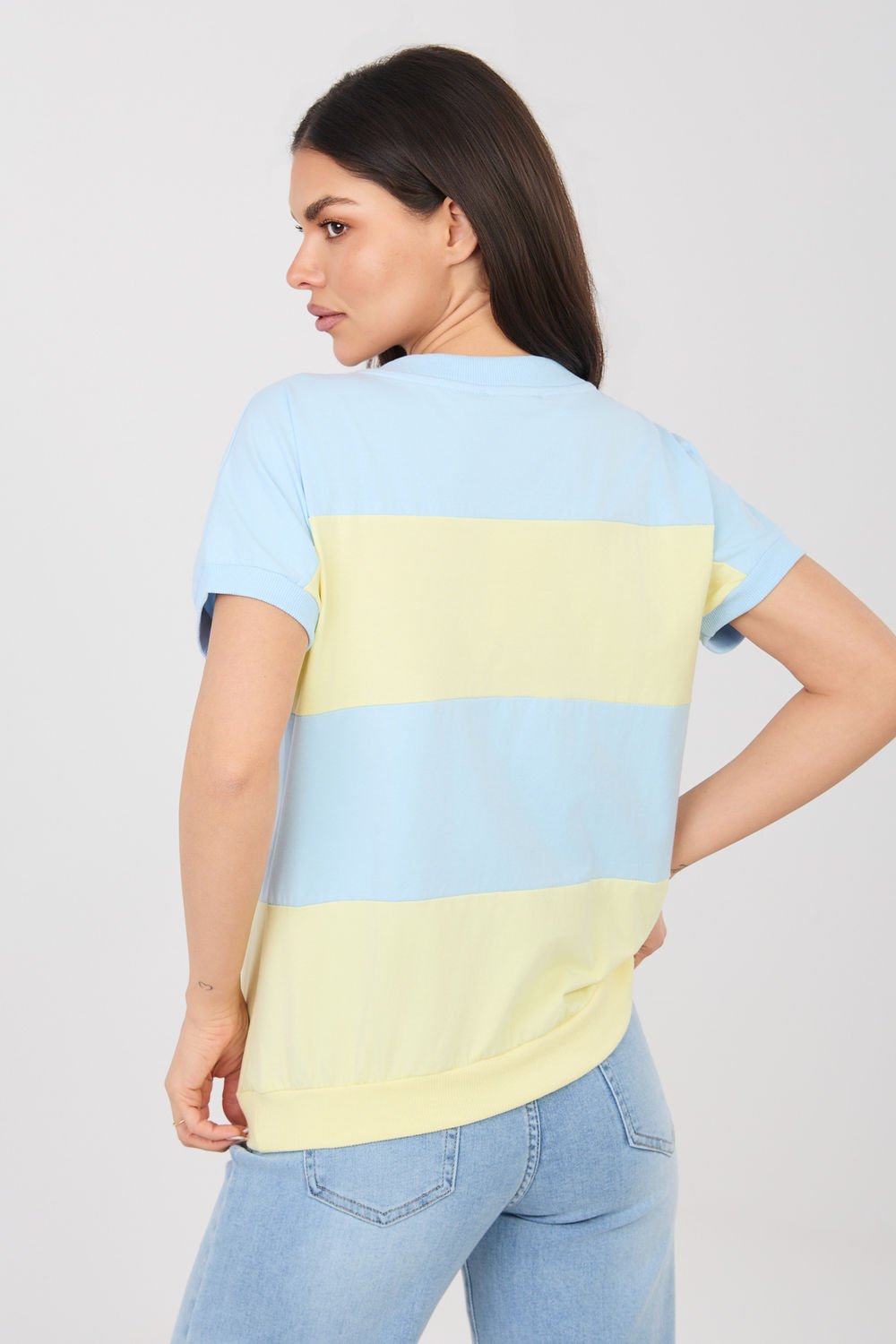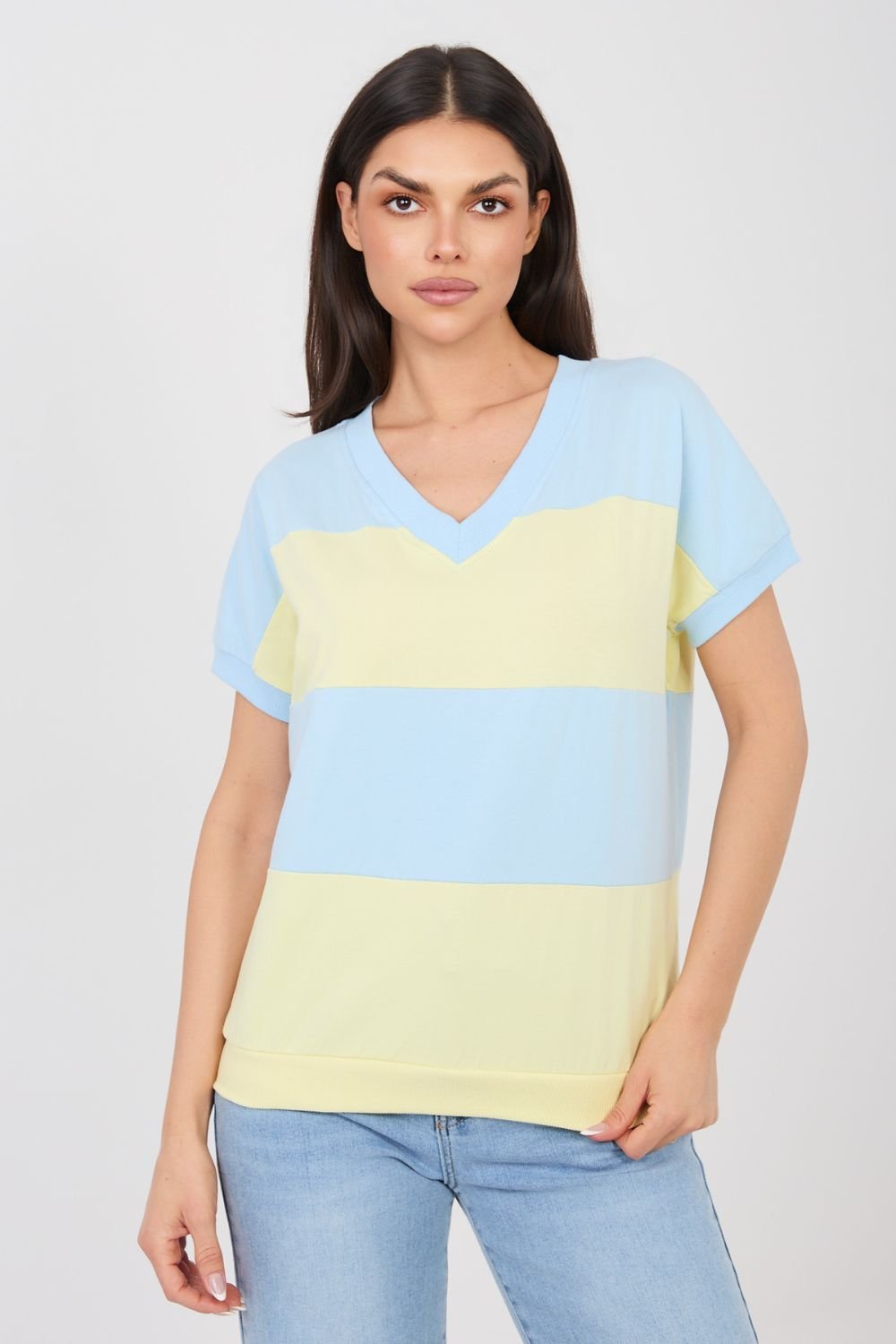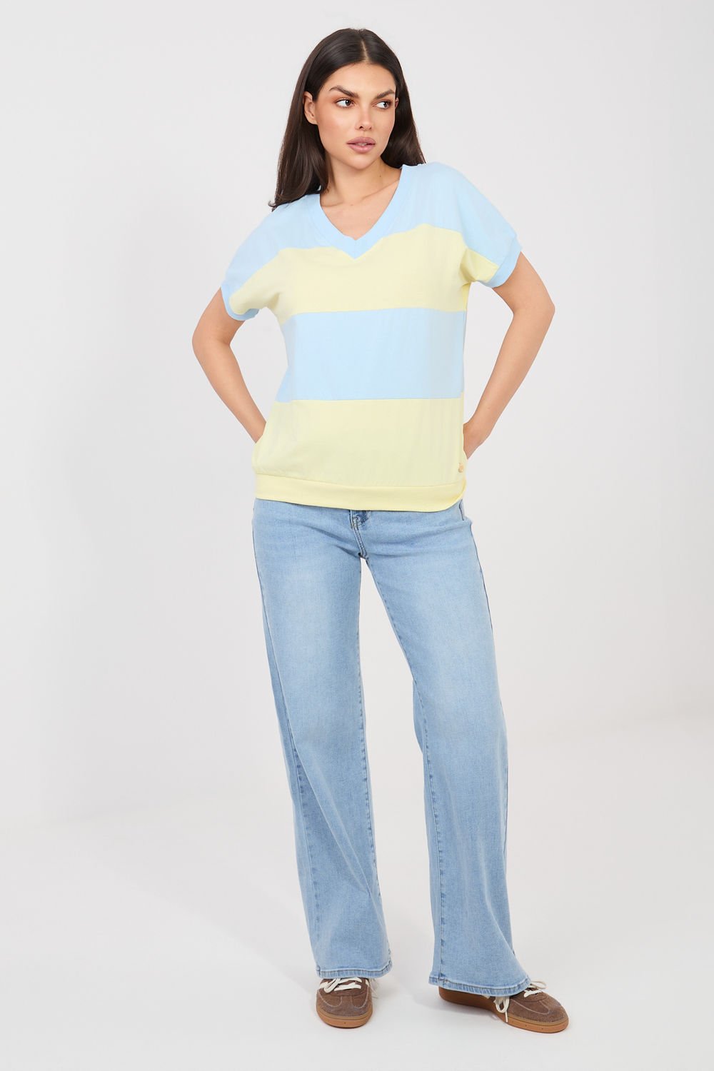 Moteriška palaidinė su plačiomis juostomis – universalus, kasdienis modelis, kurio V formos iškirptė ir trumpas rankovės kirpimas suteikia lengvumo deriniams ir akcentuoja kaklo liniją. Audinys iš medvilnės su elastanu užtikrina minkštumą ir šiek tiek tamprumo, todėl palaidinė gerai laikosi ant silueto ir nevaržo judesių. Standartinis ilgis tinka tiek dėvėti su aukštesnio liemens kelnėmis, tiek sijonu.