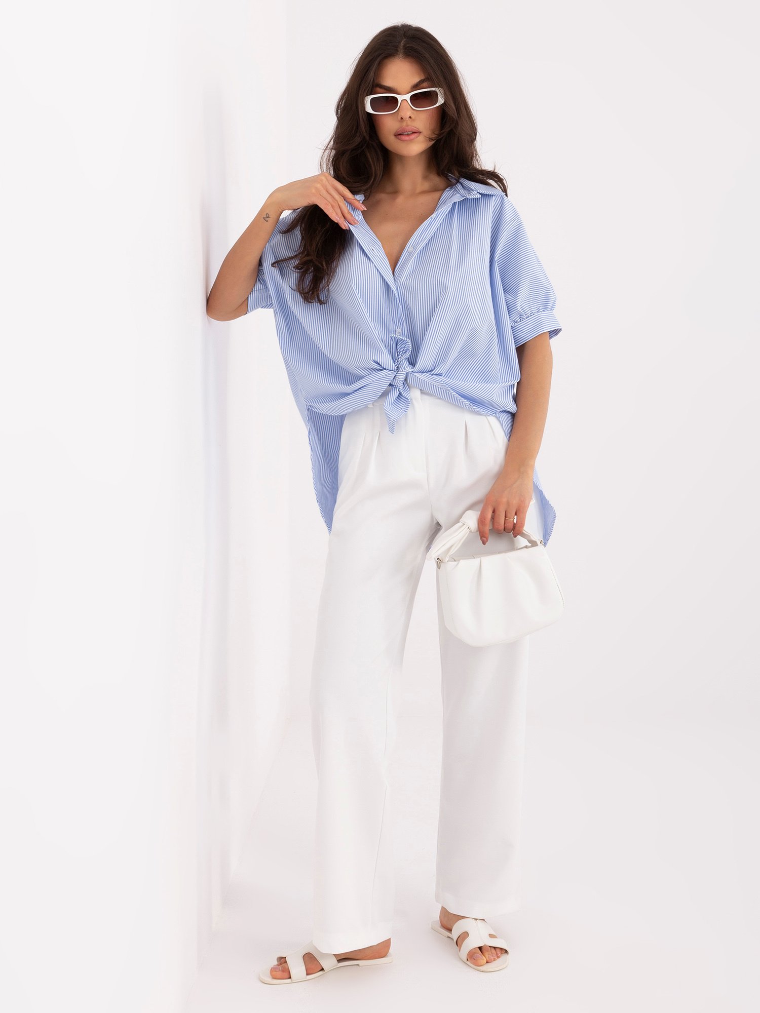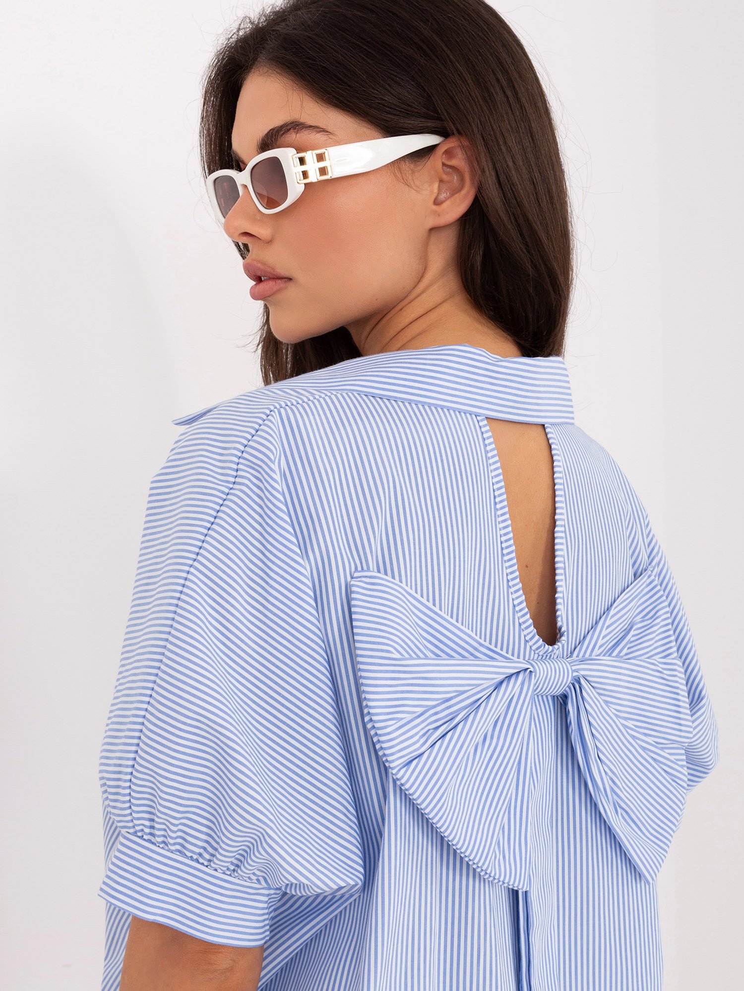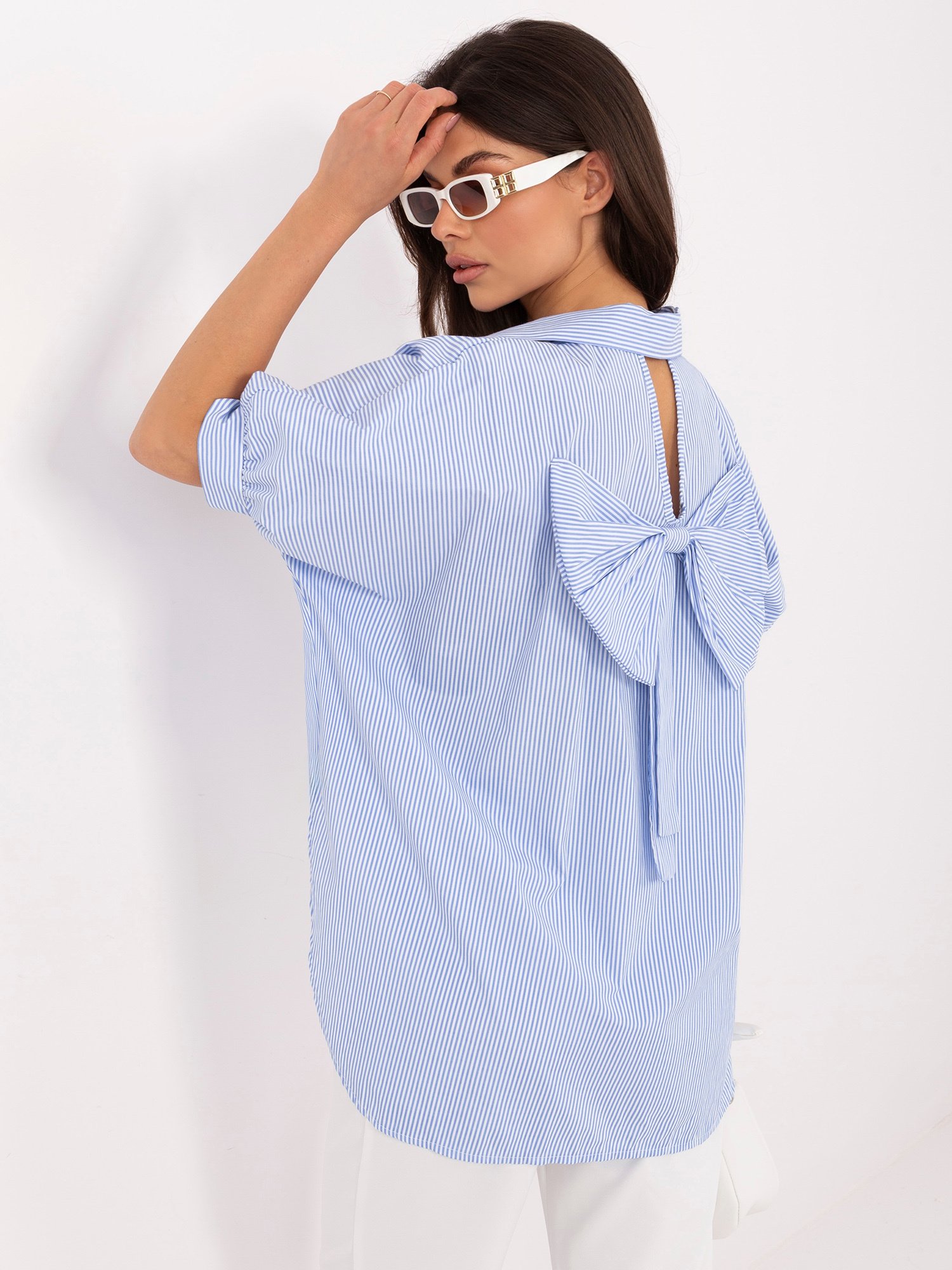 Moteriška palaidinė su dekoratyviu raštu; matomos pagrindinės spalvos – balta ir mėlyna. Dydis pažymėtas kaip vienas dydis.