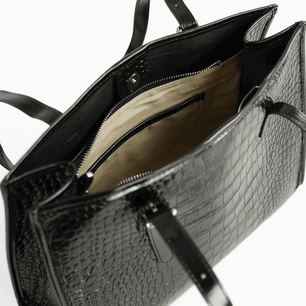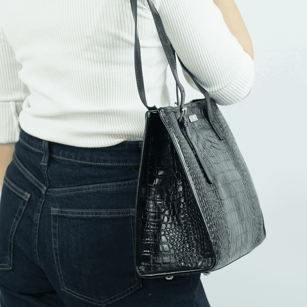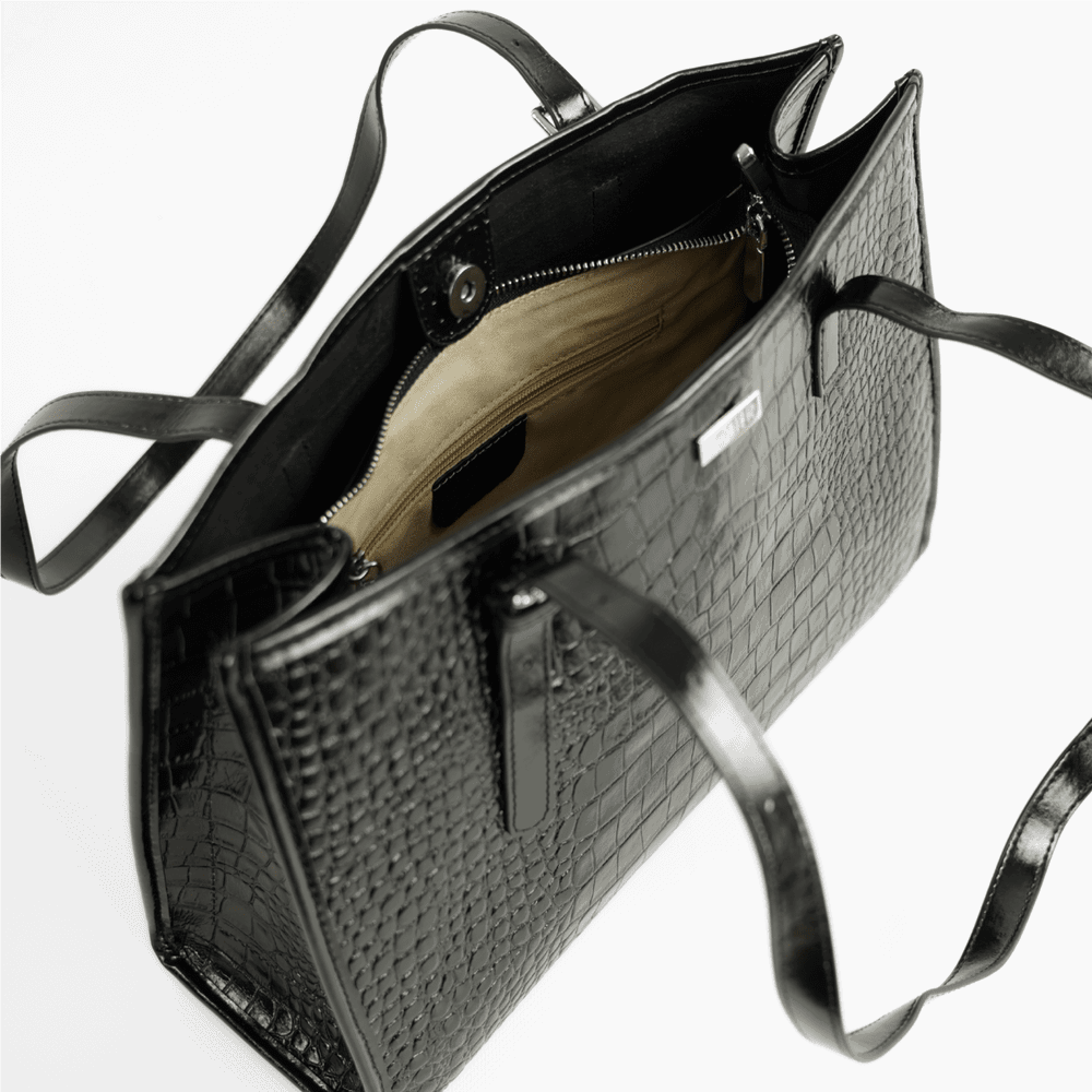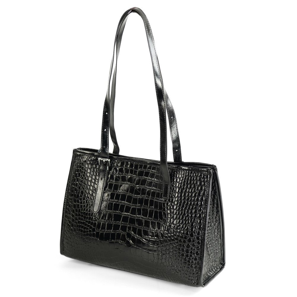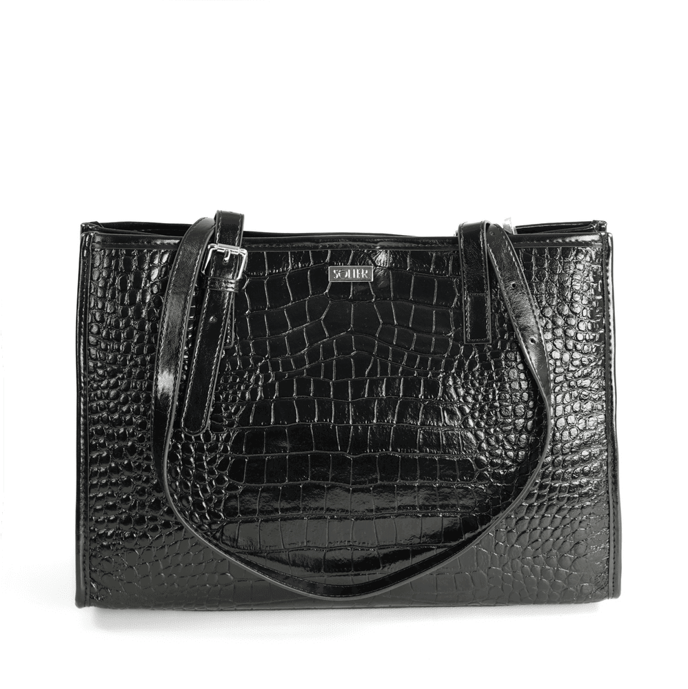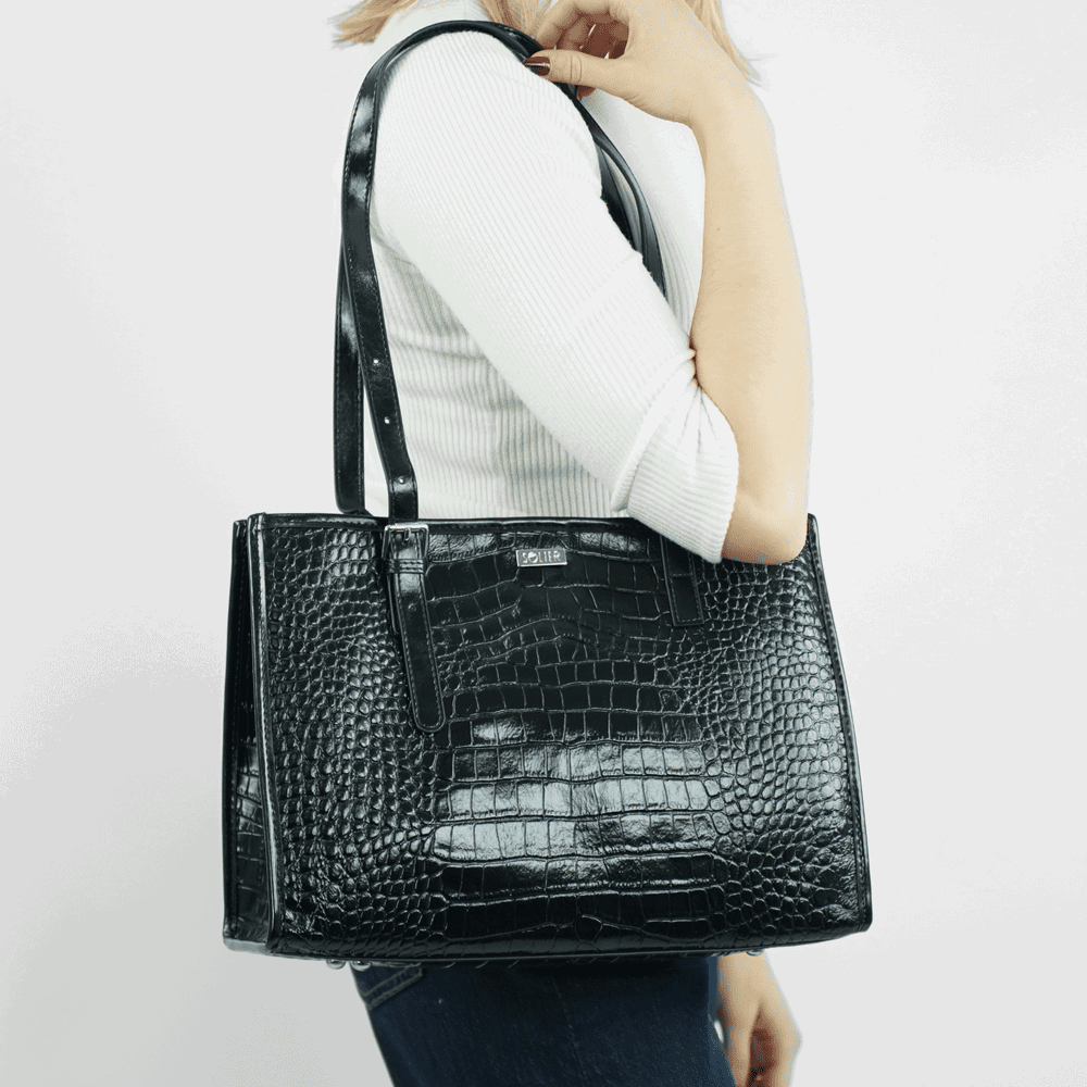 Moteriška rankinė per petį su krokodilo raštu. Juoda lakiruota natūrali oda suteikia subtilų blizgesį ir leidžia lengvai derinti rankinę prie tiek kasdienių, tiek formalesnių aprangos derinių. Matmenys 26,5 × 36 × 11 cm užtikrina pakankamą talpumą dokumentams, planšetui ar kosmetinei; viduje yra pagrindinė skyrius su užtrauktuku ir papildomas snap užsegimas dėl saugumo. Solier modelis pasižymi reguliuojamais rankenomis ir metaliniais kojelėmis, kurios saugo dugną nuo nešvarumų.