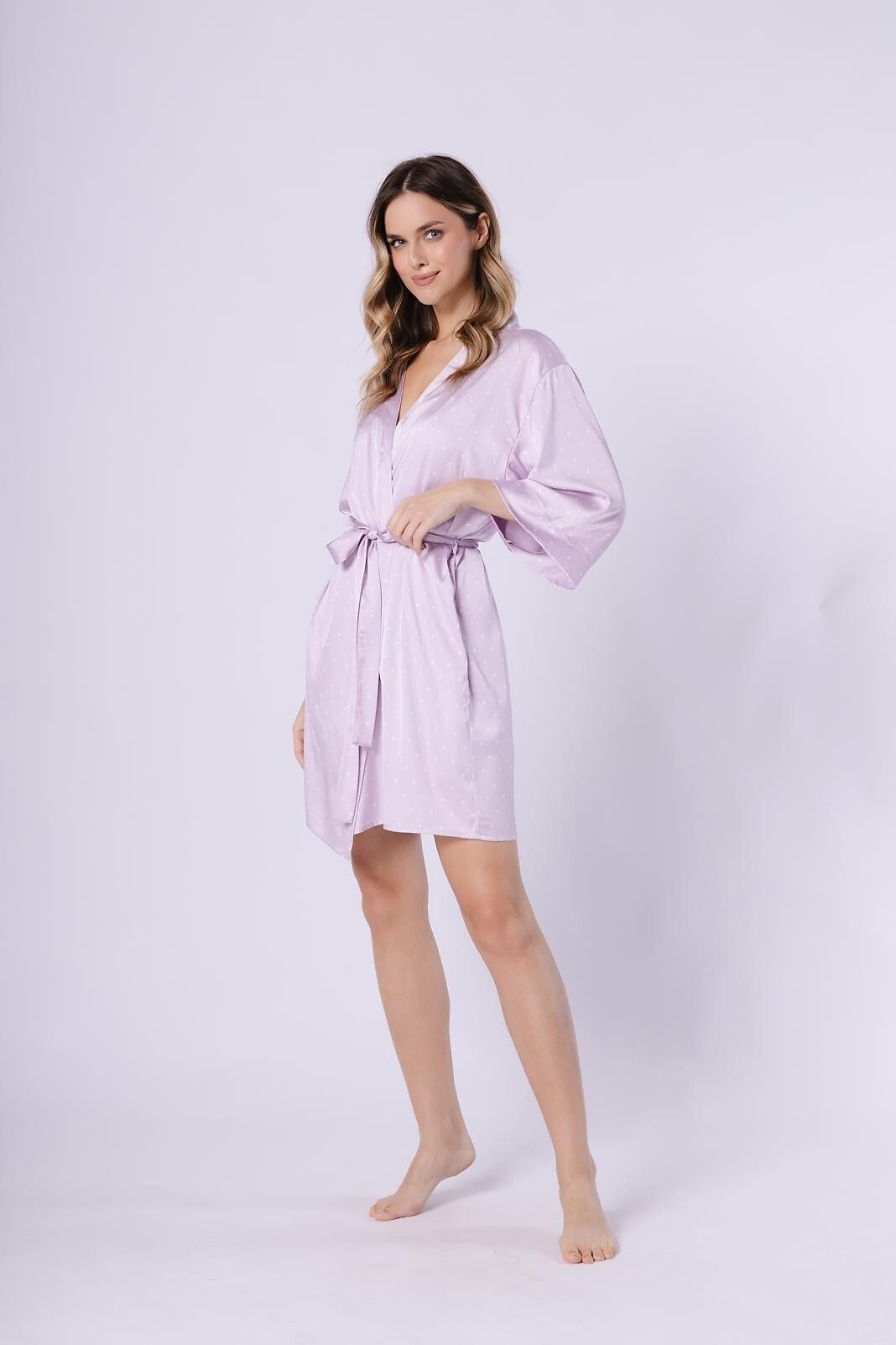moteriškas chalatas kelio ilgio – elegantiškas satinas suteikia švelnumą odai, o laisvas kirpimas kartu su 3/4 rankovėmis leidžia nevaržomai judėti namuose. Chalatas turi liemens įsirišimą ir šonines kišenes, kas palengvina kasdienį naudojimą ir laikymą smulkmenų. Gaminyje naudojamas 100% poliesteris, todėl audinys išlaiko blizgesį ir formą po skalbimo.