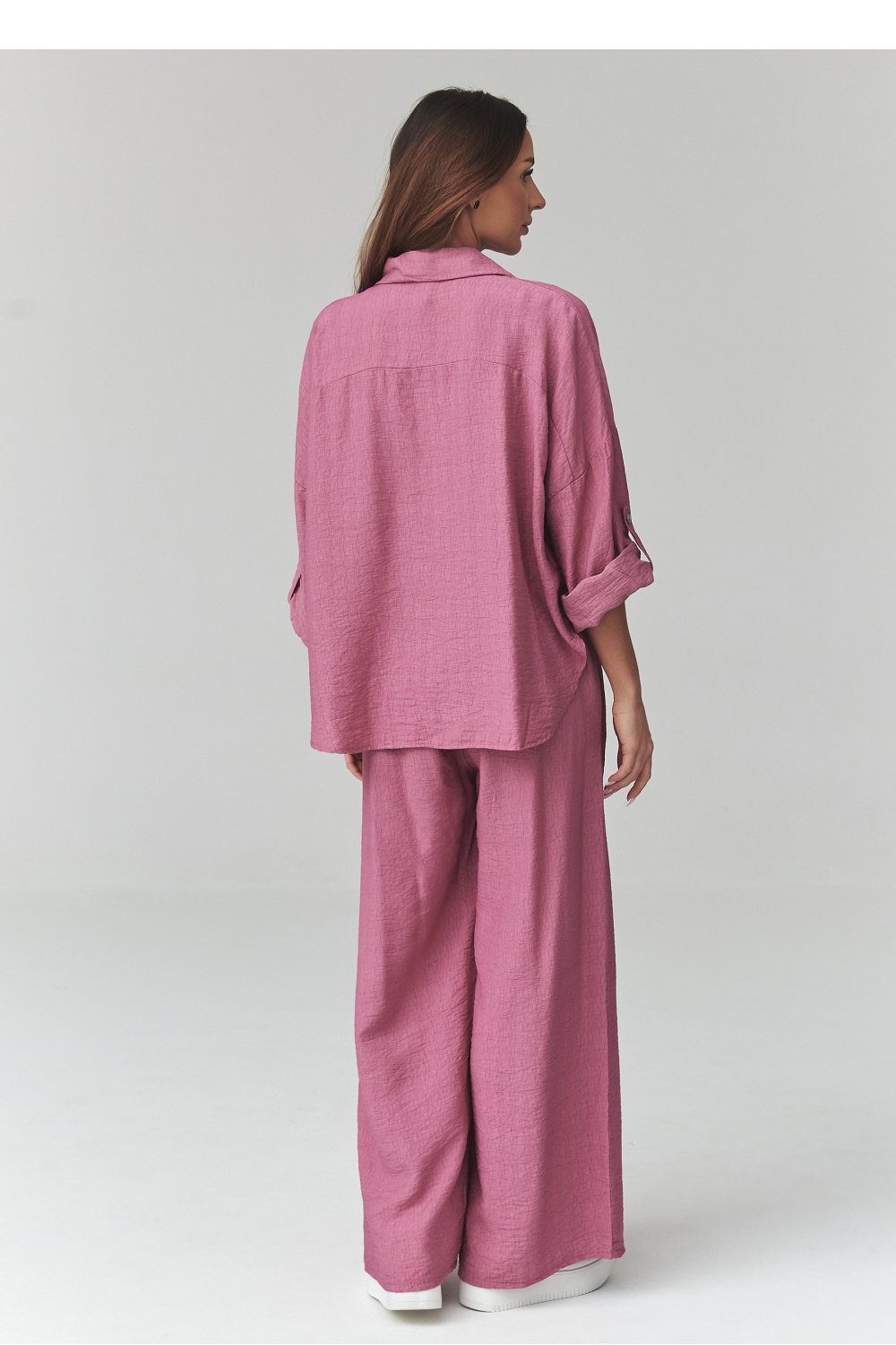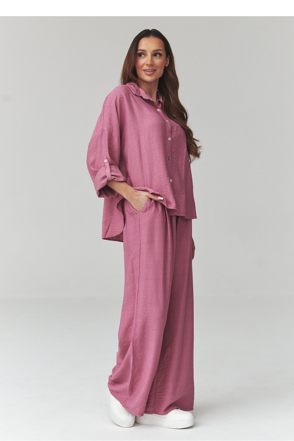 Moteriškas komplektas su plačiomis kelnėmis – laisvai priglundantį marškinėlį ir plačias kelnes su elastingu liemeniu; universalus pavasario–vasaros variantas, pagamintas iš viskozės, suteikia vėsumą ir dienos komfortą. Komplektas išsiskiria laisvo kirpimo palaidine su sagomis ir plačiomis kelnėmis, todėl judėti patogu, o itališka gamyba užtikrina tvarkingą siuvimą. Makadamia pabrėžia natūralų kritimą ir lengvumą, todėl derinsite komplektą tiek su sportbačiais, tiek su basutėmis.