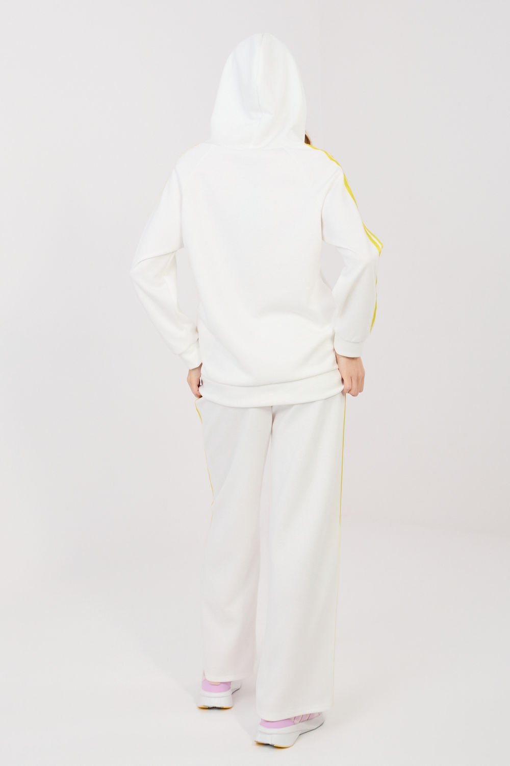 Moteriškas sportinis komplektas su gobtuvu – dviejų dalių rinkinys (džemperis su gobtuvu ir kelnės) iš švelnaus, tampraus mišinio, suteikiantis komfortą ir laisvę judėti visą dieną. Užtrauktuku užsegamas džemperis su rankovėmis ir dryžuotomis detalėmis įgauna sportišką charakterį, o kelnės aukštu liemeniu ir plačiomis kojų dalimis užtikrina patogų prigludimą ir judėjimo laisvę.