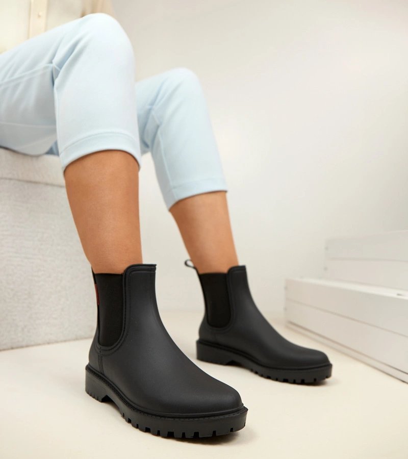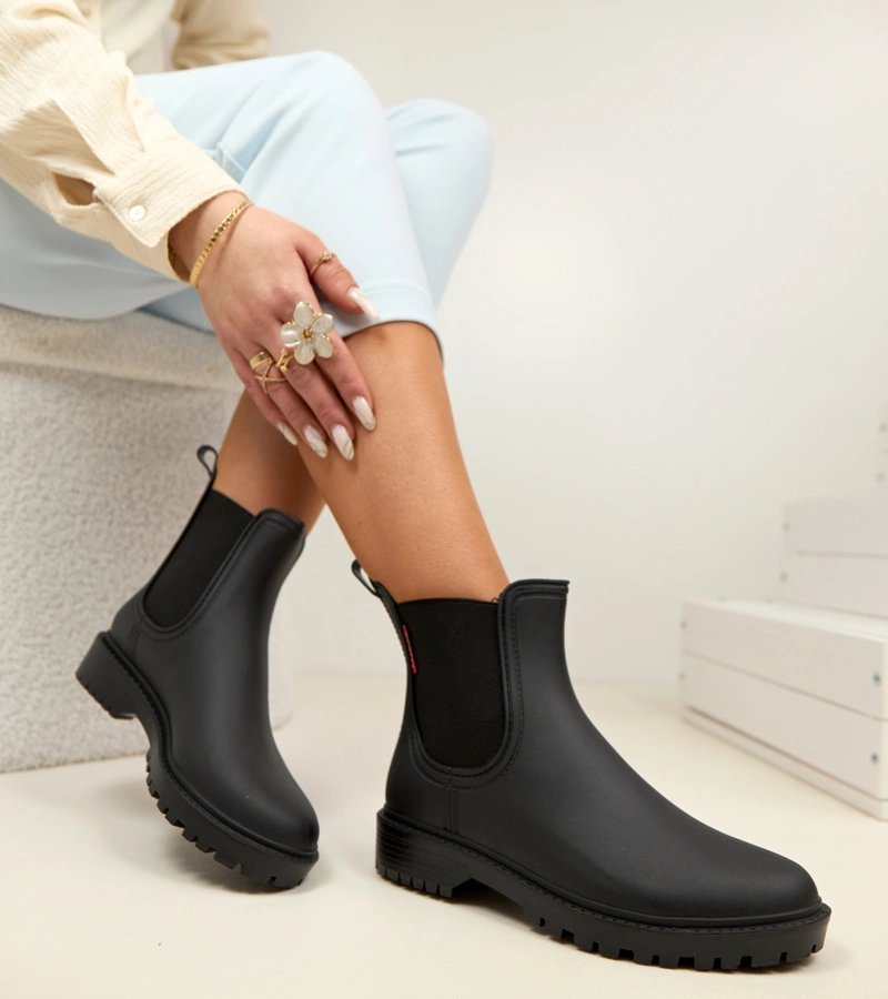 Moteriški guminiai batai iš gumos – juodos spalvos, iki kulkšnies, skirti apsaugai nuo lietaus ir purvo. Šie aulinukai pasižymi lengvu užmovimu ir paprastu dizainu, todėl tiks kasdienėms miesto ar lauko sąlygoms. Juoda spalva dera su įvairia avalyne ir apranga, o kulkšnies aukštis suteikia papildomą apsaugą nuo purslų ir drėgmės.