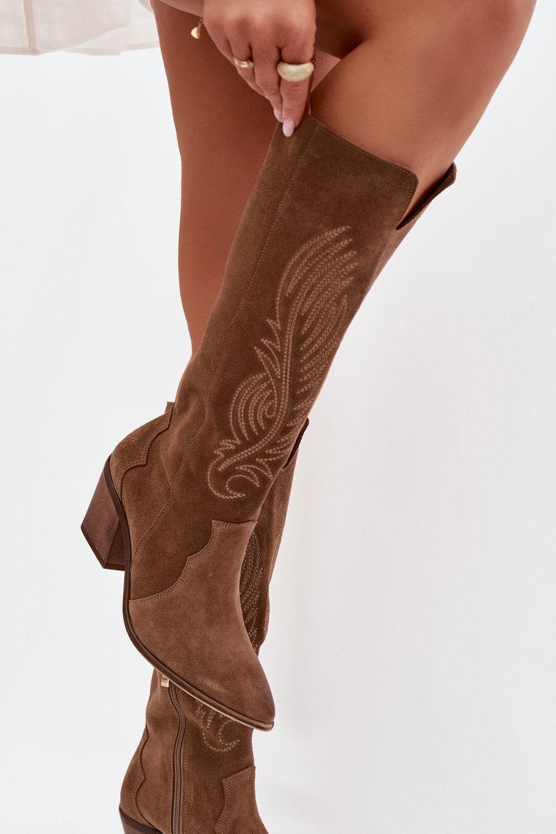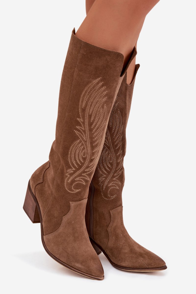 Moteriški ilgaauliai batai su smailiu nosimi suteikia vakarinės ir kasdienės aprangos akcentą ir pabrėžia siluetą, tuo pačiu išlaikydami patogumą dėvint. Dėl natūralios zomšos paviršiaus batai atrodo švelniai ir tekstūriškai, o šoninis užtrauktukas palengvina užsimovimą. Smailus nosis ir ściętas obcasas kuria western stiliaus įvaizdį, tinkantį tiek prie suknelės, tiek prie siaurų džinsų.