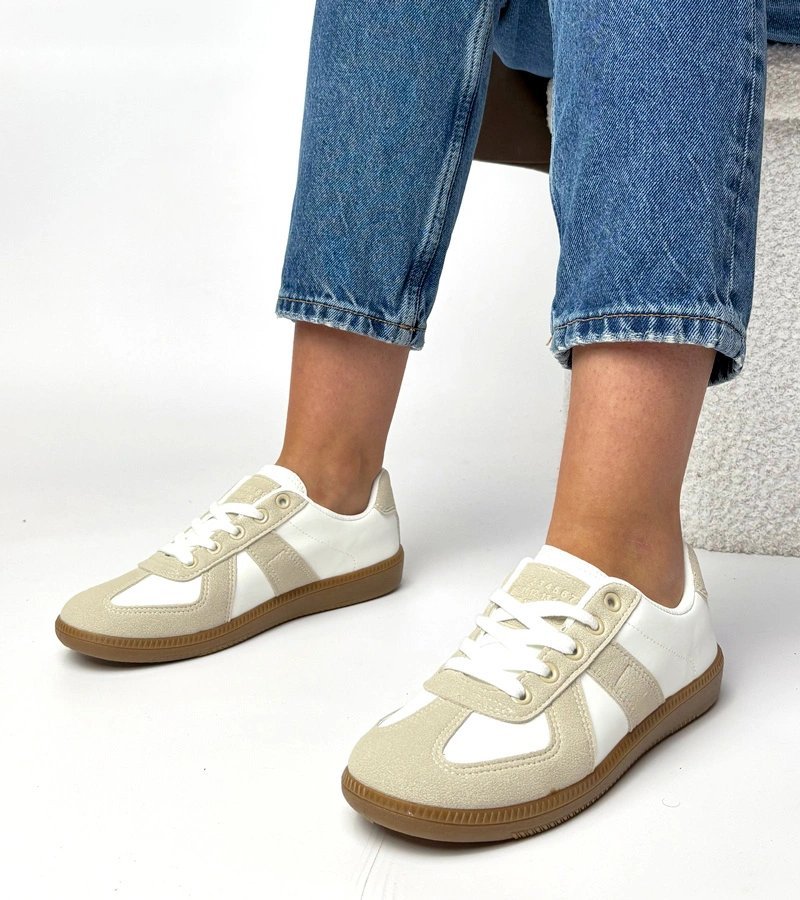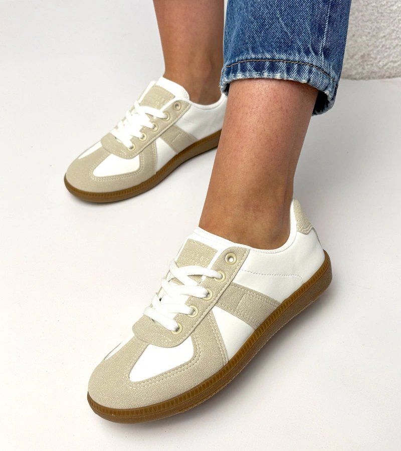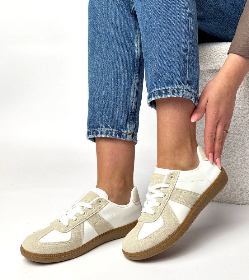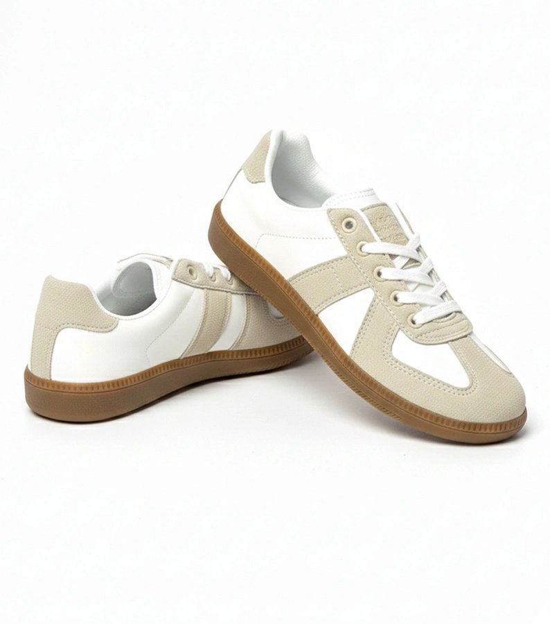Šie platforminiai sportiniai bateliai skirti moterims, ieškančioms stilingo ir patogaus pasirinkimo kasdienai. Modelis pasižymi balta ir smėlio spalvų deriniu, kuris lengvai derinamas su įvairia apranga. Platforma suteikia aukščio ir vizualinio lengvumo, išlaikant komfortą ilgesniam nešiojimui.