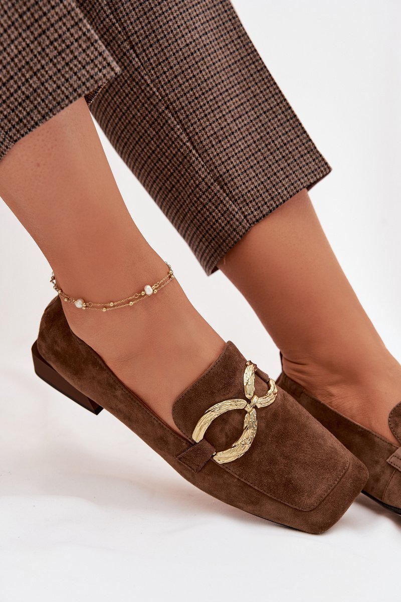 Moteriški mokasinai rudi iš natūralios zomšos – plokščias kulnas ir minkšta cholevka užtikrina patogų vaikščiojimą visą dieną, o kvadratinis noselis suteikia šiuolaikiško charakterio.