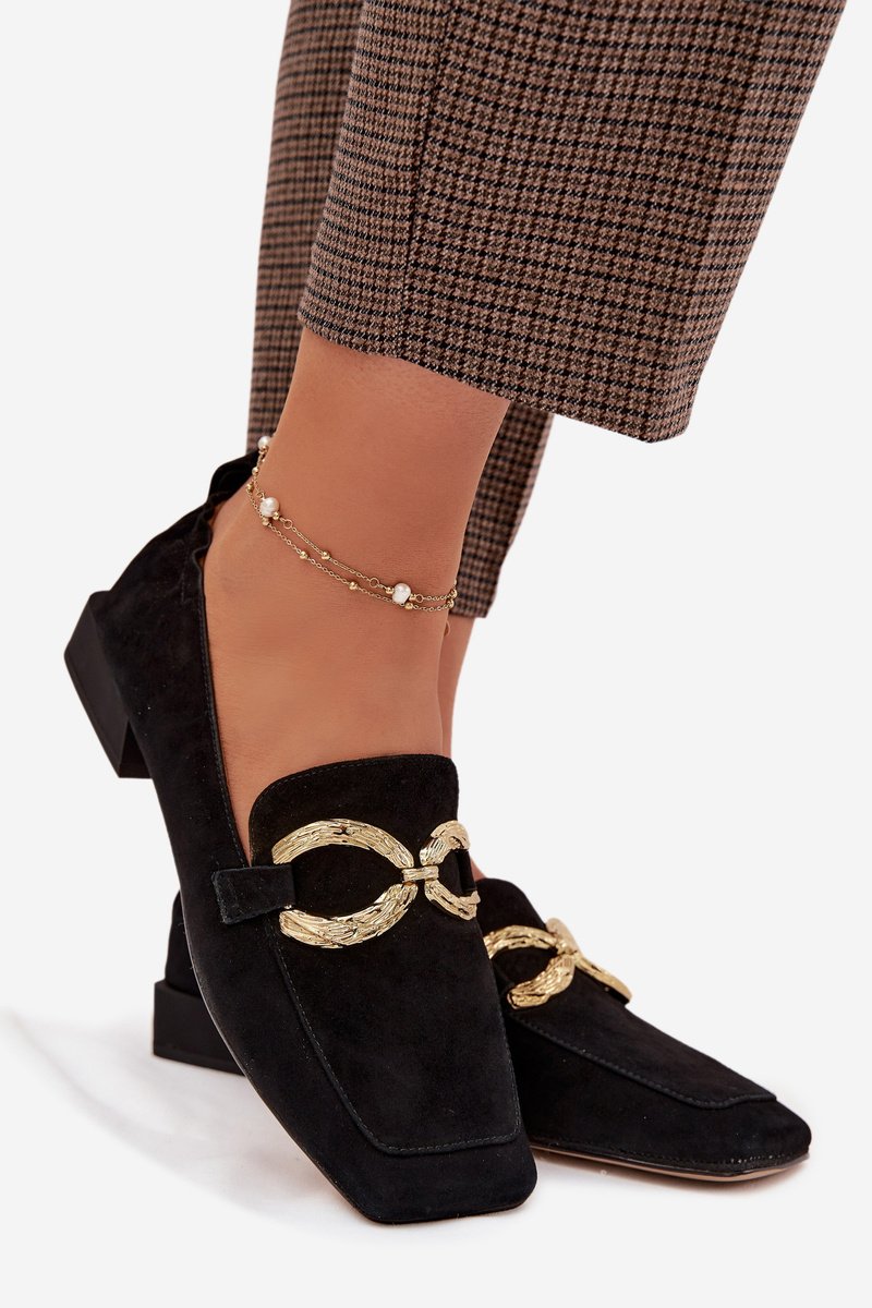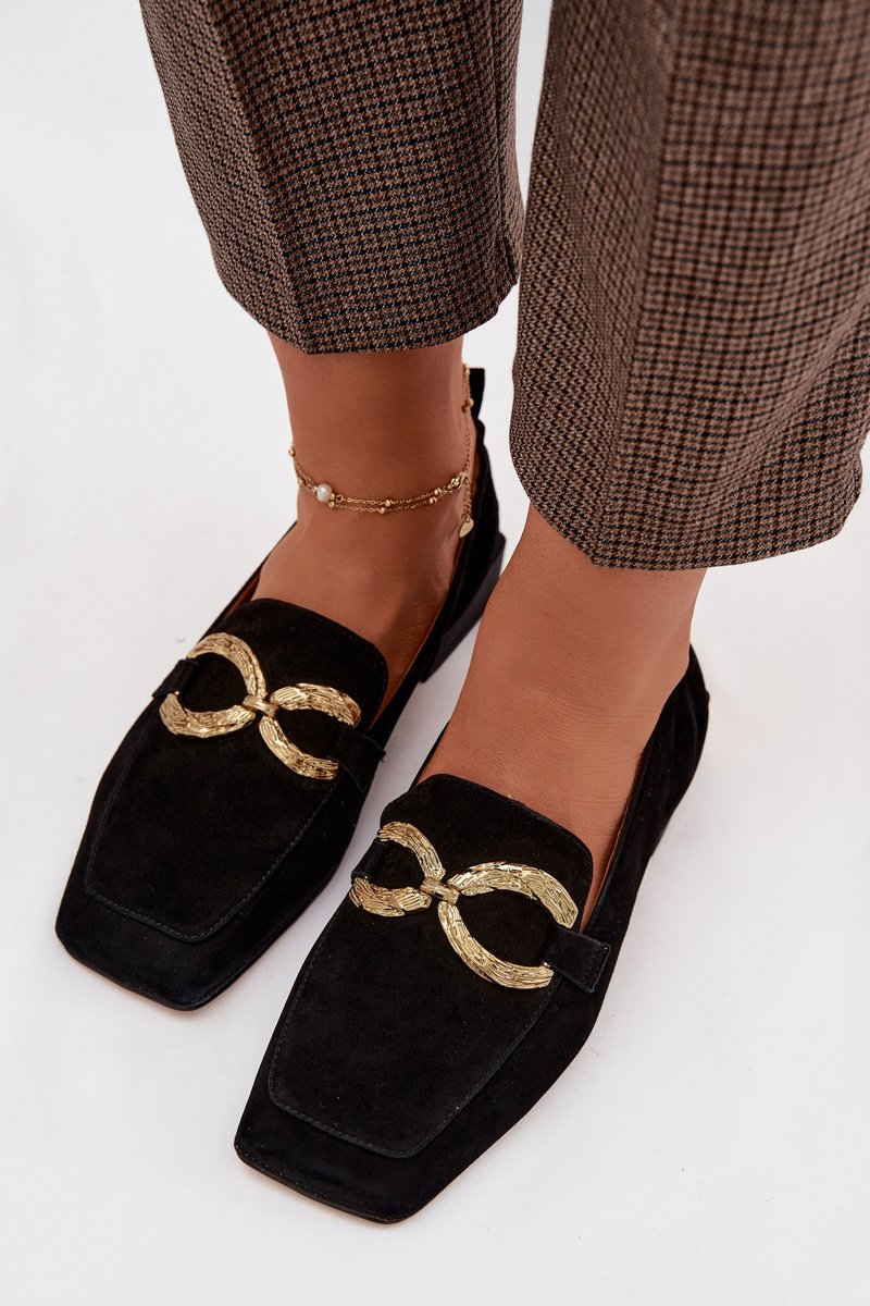Moteriški mokasinai iš zomšos su kvadratiniu noseliu ir žemu padu – elegantiški kasdienėms ir šiek tiek formalesnėms avalynės deryboms. Minkšta viršutinė dalis suteikia komfortą vaikščiojant, o dekoratyvus auksinis akcentas paryškina stilistiką be perdėto blizgesio. Modelis tinka darbui biure ir laisvalaikiui, kai norima derinti klasikinį siluetą su moderniu akcentu.