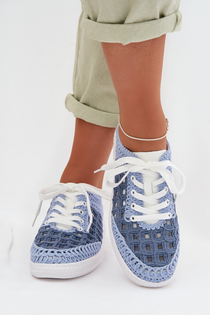 Moteriški mokasinai pintu viršumi – mėlyni, su natūralios odos ir audinio deriniu, suteikia geresnę oro pralaidumą ir patogumą šiltesnėmis dienomis. Maža platforma minkština žingsnį, o klasikinis šnurovimas leidžia pritaikyti prigludimą prie pėdos. Renkantis dydį, vadovaukitės pateikta dydžių lentele.