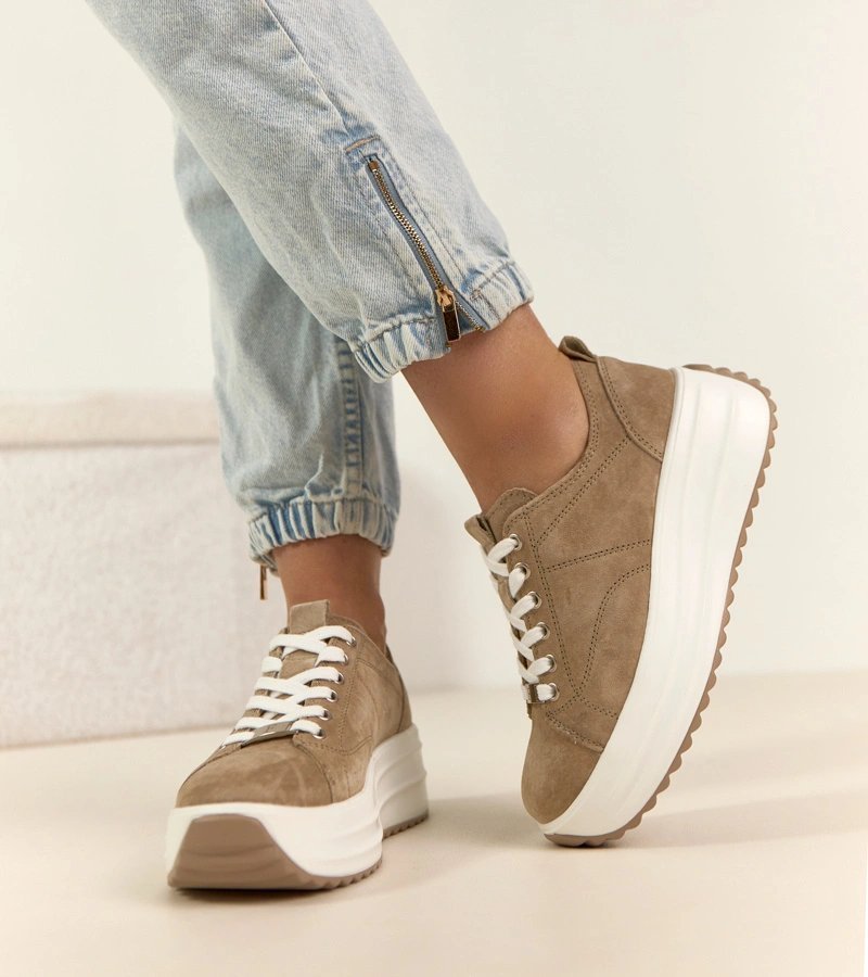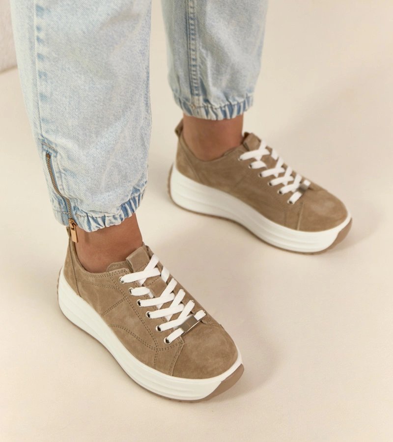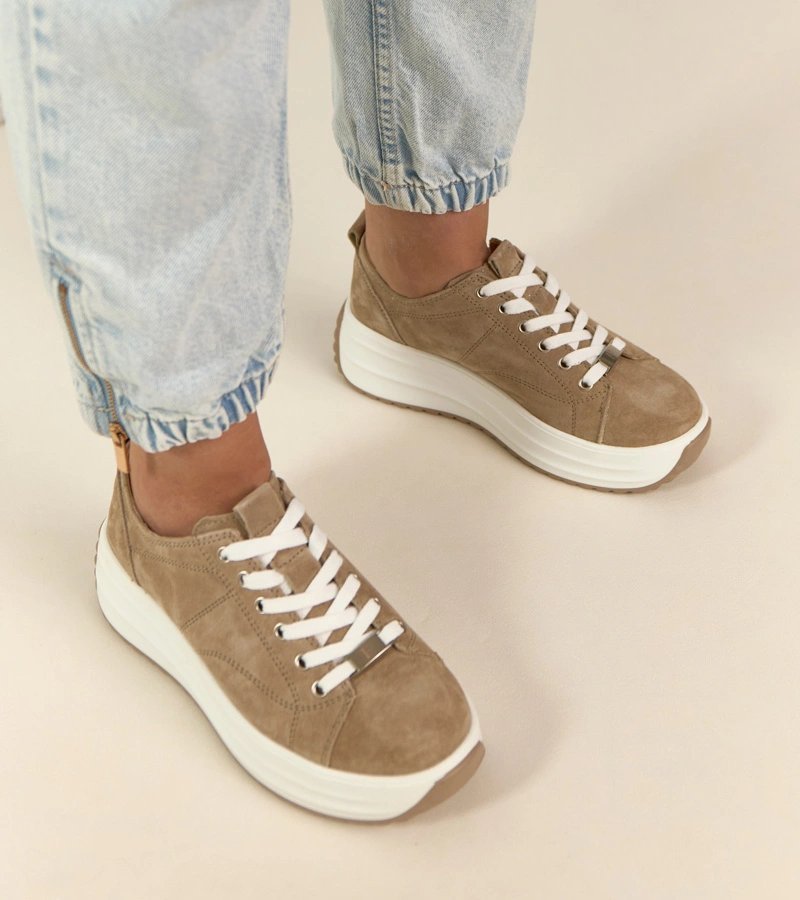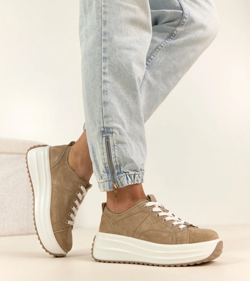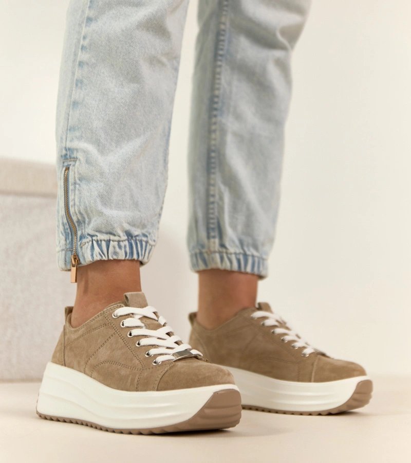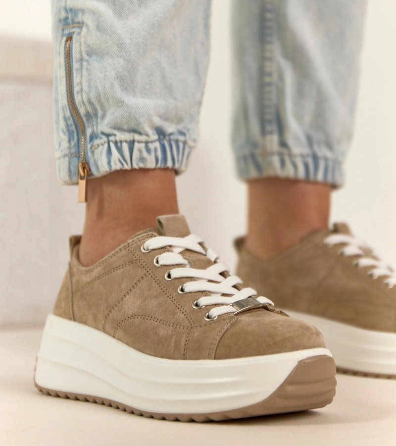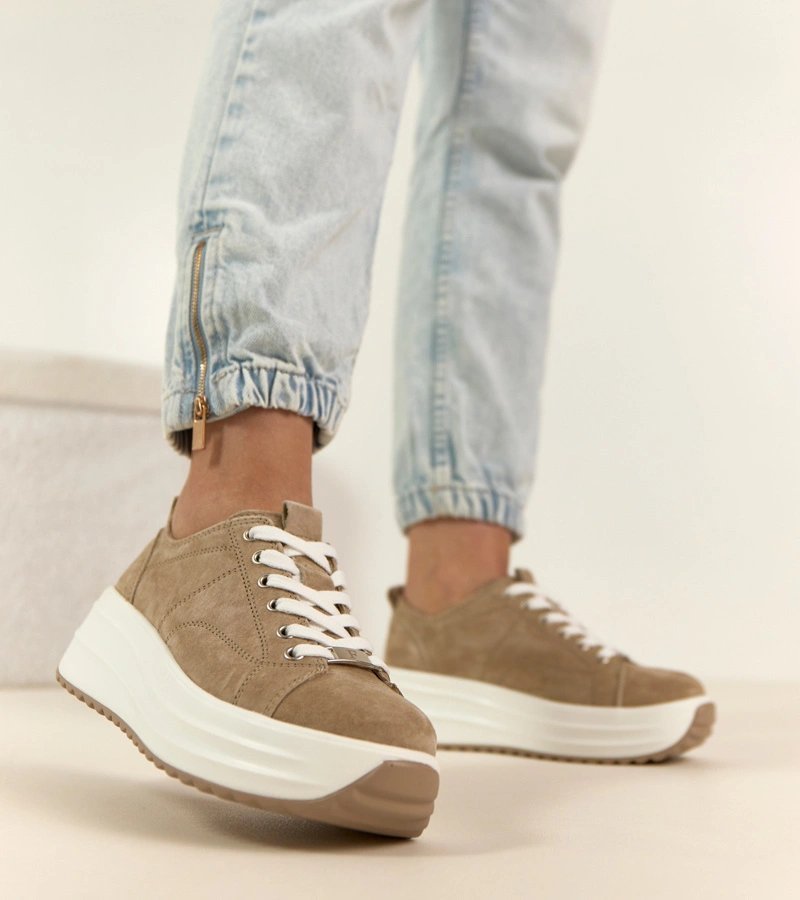 Platforminiai sportbačiai iš natūralios odos kreminės spalvos turi platforminę konstrukciją. Natūrali oda suteikia subtilią tekstūrą ir gerai dera su neutraliomis spalvomis.