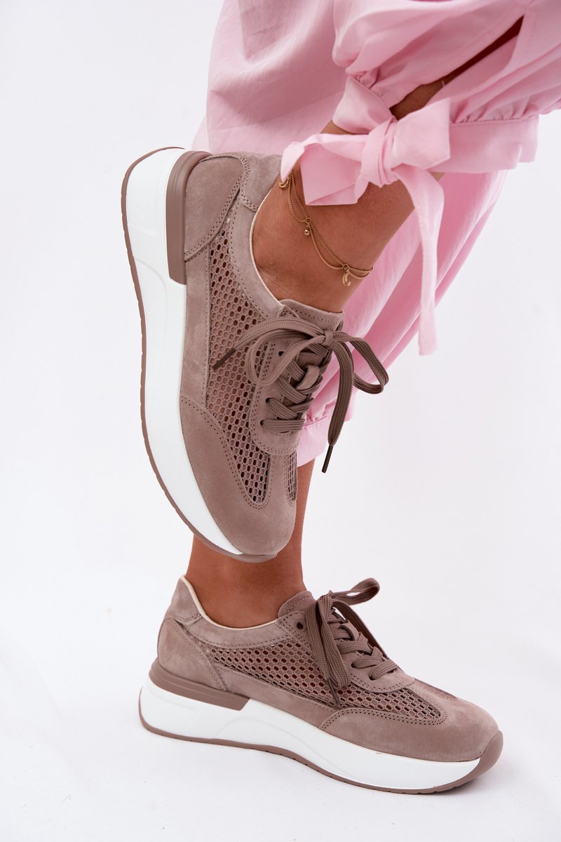 Platforminiai sportbačiai, pagaminti iš natūralios zomšos su tinkliniais intarpais; modelis „Norisa“ turi perforuotą, orui laidžią viršutinę dalį ir komforto tipo vidpadį.