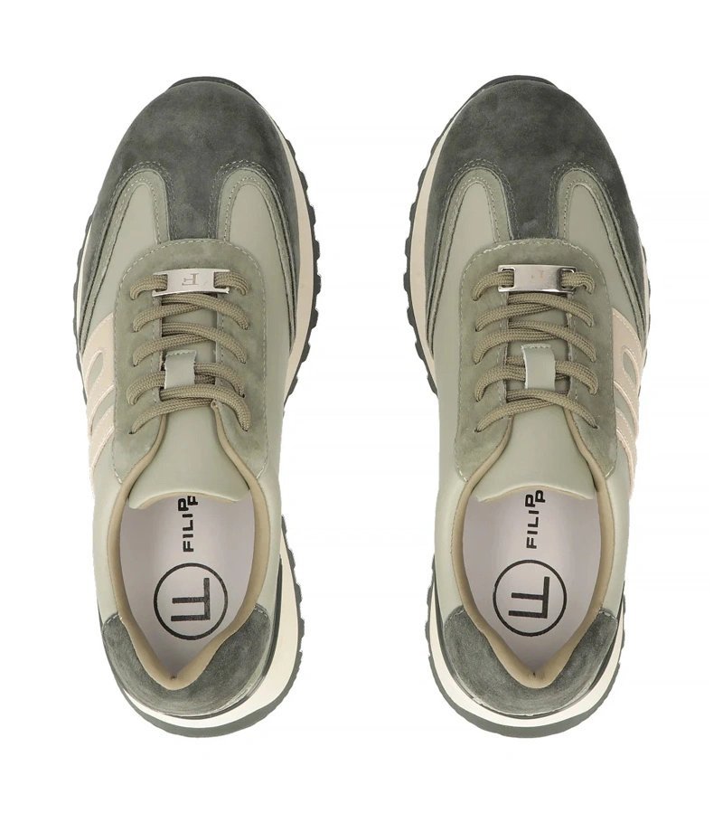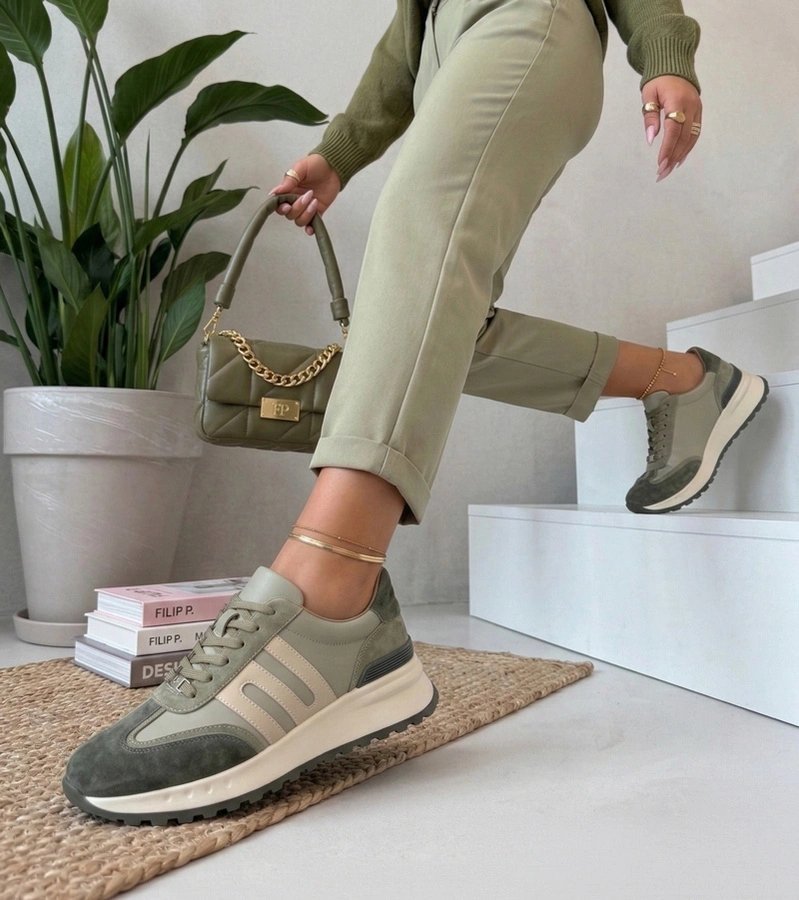 Moteriški sportbačiai žalios spalvos – ryškus akcentas kasdienei avalynei, kuris išsiskiria spalva ir patogiu platformos profiliu. Pagaminti iš natūralios odos, jie turi natūralų blizgesį ir aiškų paviršiaus charakterį. Platformos padas suteikia papildomo aukščio be didelio diskomforto, o Filippo modelis pabrėžia šio stiliaus kontūras.