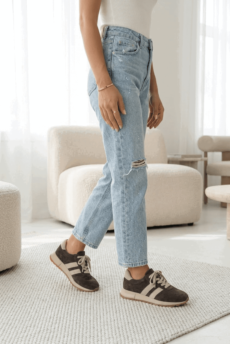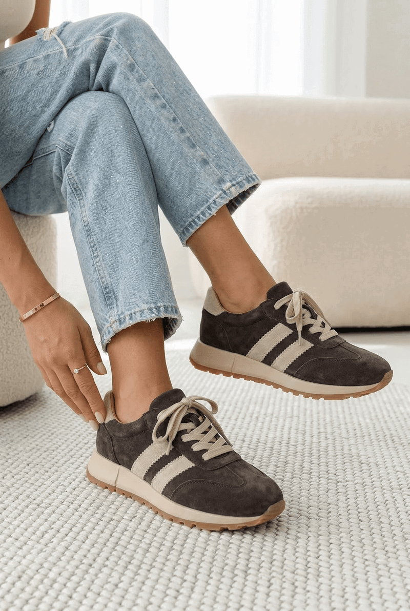Moteriški sportbačiai iš zomšos – odinis minkštas vidpadis suteikia geresnį amortizavimą ir komfortą ilgesniems pasivaikščiojimams mieste. Ruda spalva dera su džinsais ir laisvalaikio kelnėmis, o dvipusės dekoratyvinės juostos modernizuoja sportinį siluetą. Pateikiami dydžiai padės tiksliai pasirinkti tinkamą ilgį; Marceline prekės ženklas pabrėžia vidpadžio komfortą.