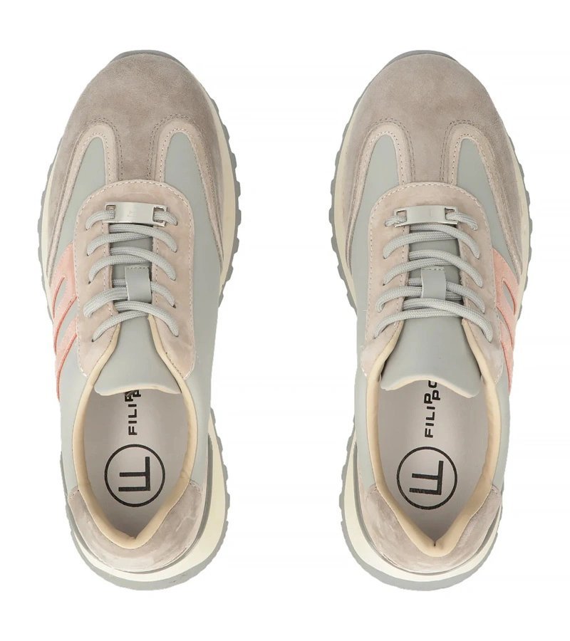 Moteriški sportbačiai iš natūralios odos yra patvarus pasirinkimas kasdieniam nešiojimui, o pilkos spalvos derinasi prie įvairių stilių; Filippo versija išsiskiria paprastu siluetu ir platformos efektu. Dėl natūralios odos paviršiaus batai geriau formuojasi prie pėdos ir tarnauja ilgiau. Platforma suteikia papildomo aukščio be aukšto kulno pojūčio, todėl batai tinka tiek miesto, tiek laisvalaikio įvaizdžiui.