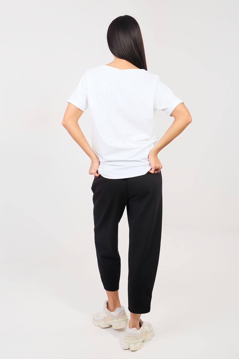 - 7/8 ilgis ir siaurėjantis kirpimas → vizualiai išryškina siluetą ir tinka derinti su sportine arba laisvalaikio avalyne.