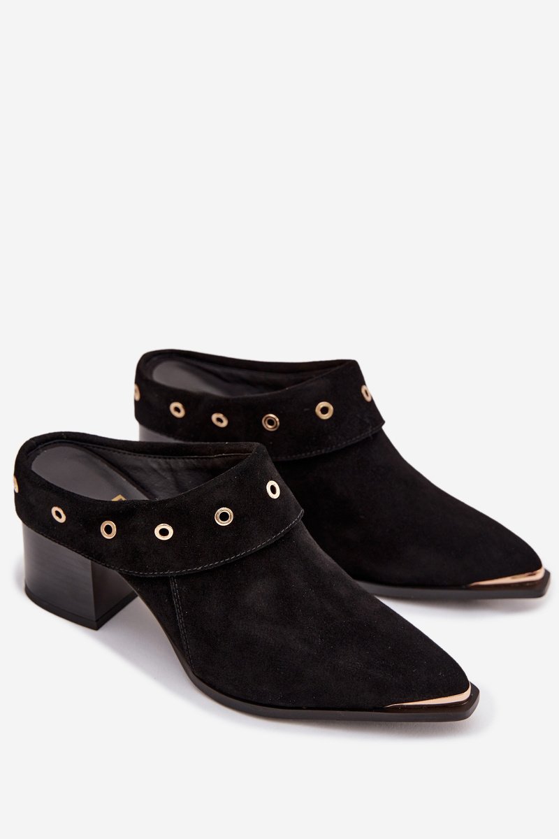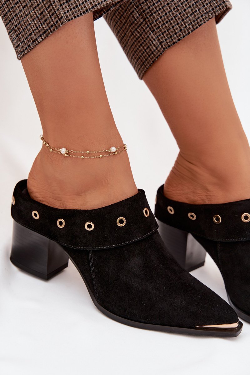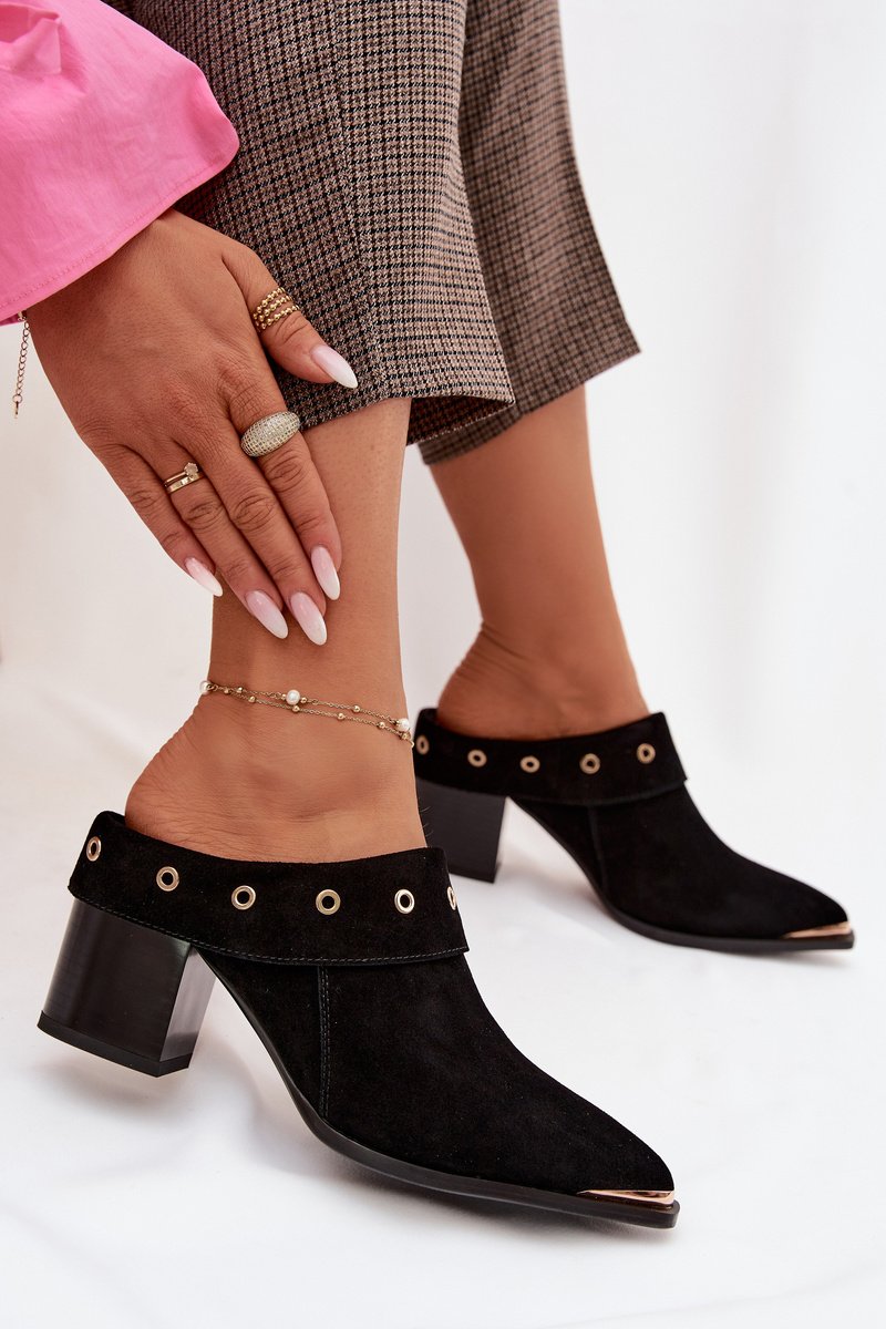 Moteriškos zomšinės šlepetės su stabiliu kulnu – ryškus pasirinkimas vakariniams ir iškilmingiems deriniams, nes stabili kulno forma suteikia komforto vaikštant ir pabrėžia siluetą. Modelis pagamintas iš natūralios zomšos, todėl batai turi minkštą, tekstūruotą paviršių ir išlaiko šiltų bei šalto sezono stilių. Juoda spalva leidžia derinti juos su įvairiomis suknelėmis, sijonais ar elegantiškomis kelnėmis, o auksinis detalas suteikia subtilaus blizgesio.