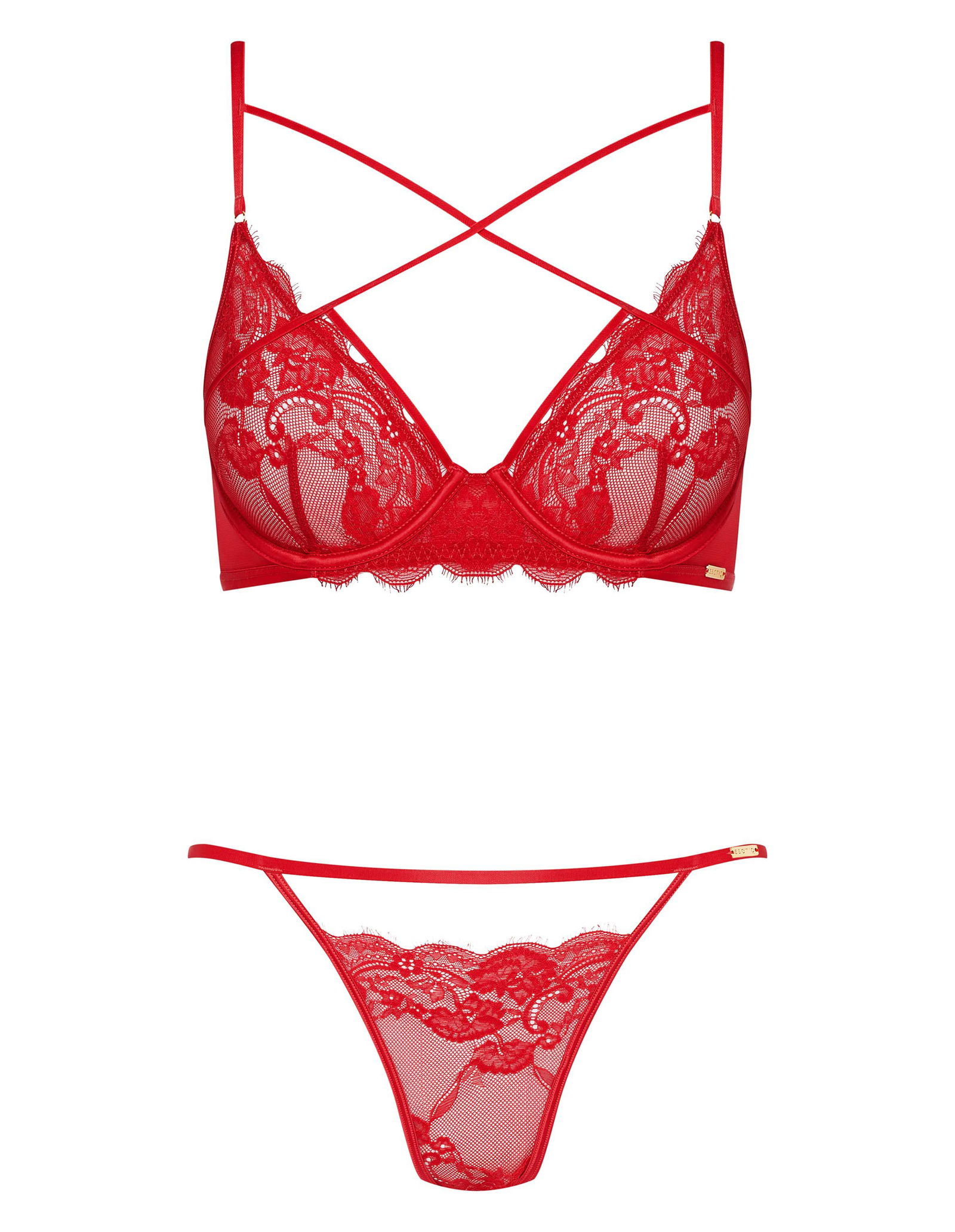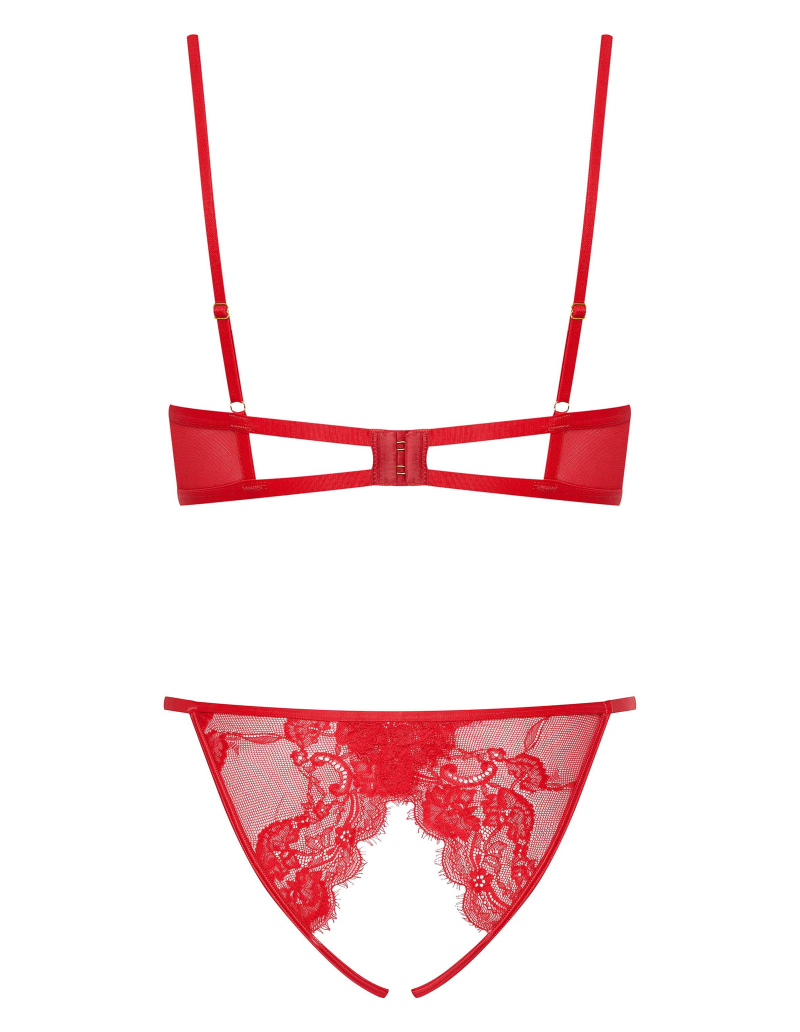 Šis seksualus moteriškas komplektas – tai stilingas rinkinys, skirtas ypatingoms progoms ar romantiškiems vakarams. Komplektą sudaro liemenėlė su apatiniais lankeliais ir figų tipo kelnaitės su atviru tarpkoju. Elegantiška nėrinių medžiaga ir dekoratyvios juostelės ant iškirptės suteikia išskirtinumo ir rafinuotumo.