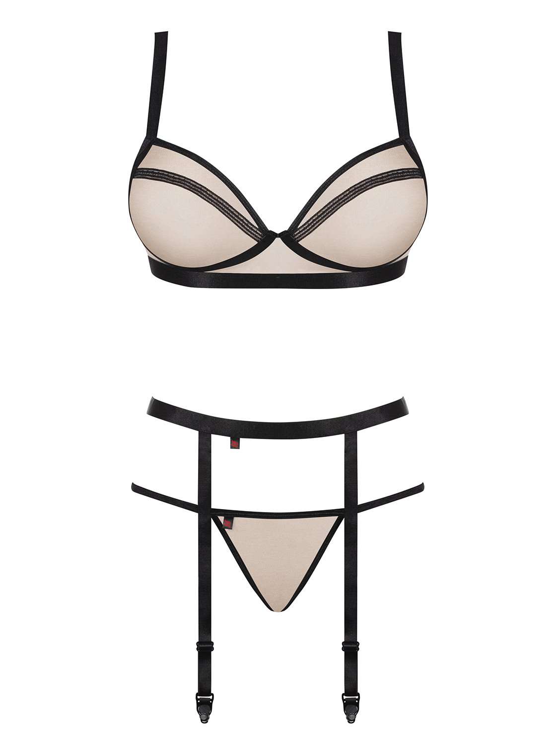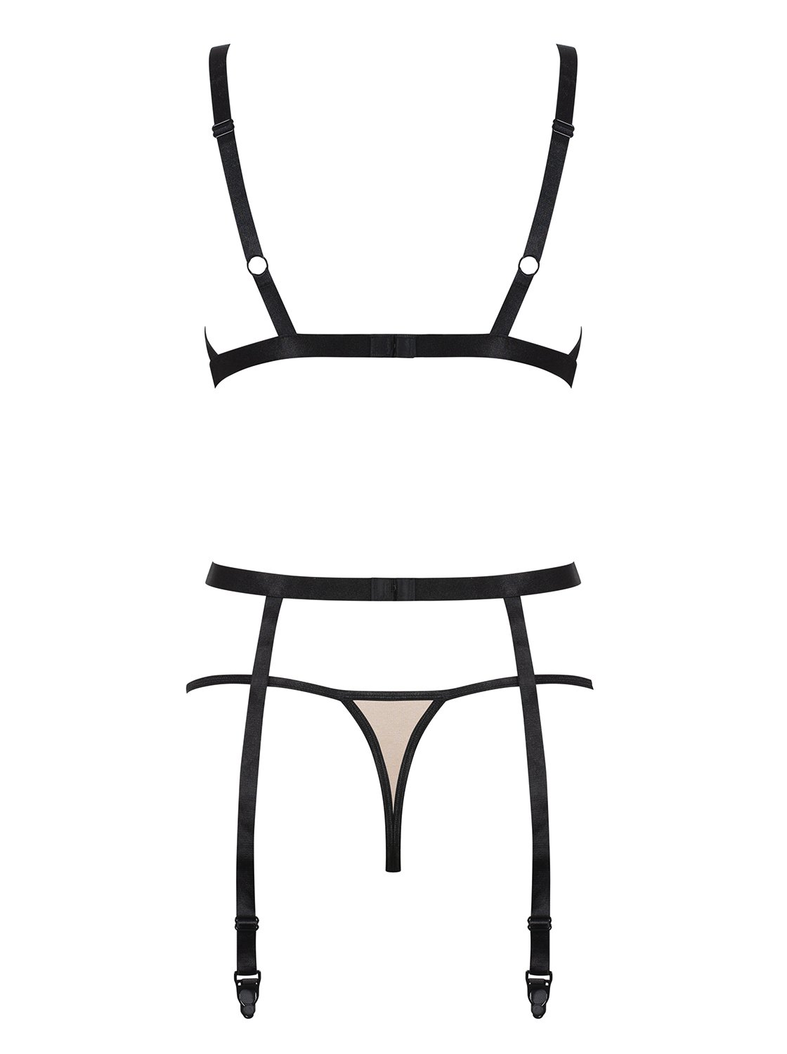 Jausmingas trijų dalių apatinio trikotažo rinkinys, idealiai tinkantis vasarai. Tikra seksualios išvaizdos garantija. Gamintojas, garsėjantis gundančiais, itin moteriškais modeliais, šį kartą mums, moterims, paruošė kažką papildomo. Komplektą sudaro liemenėlė, stringai ir petnešėlių diržas. Komplektas pagamintas iš elastingo tinklinio audinio, turinčio antros odos efektą, ir paryškintas kontrastingų spalvų apvadais, kurie suteikia charakterio. Liemenėlė yra minkštos konstrukcijos, be karkaso, dirželiais reguliuojama. Puikiai atrodo ir gražus, kuklus elastinės juostos pavidalo pėdkelnių diržas. Stringai iš karto pabrėžia sėdmenis. Pėdkelnės parduodamos atskirai. Sudėtis Sudėtis 90 % poliamidas, 10 % elastanas.