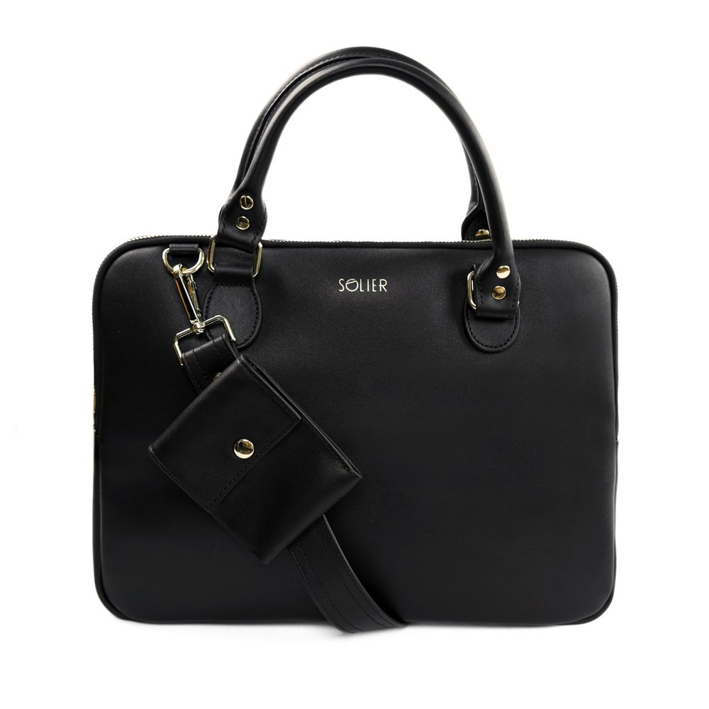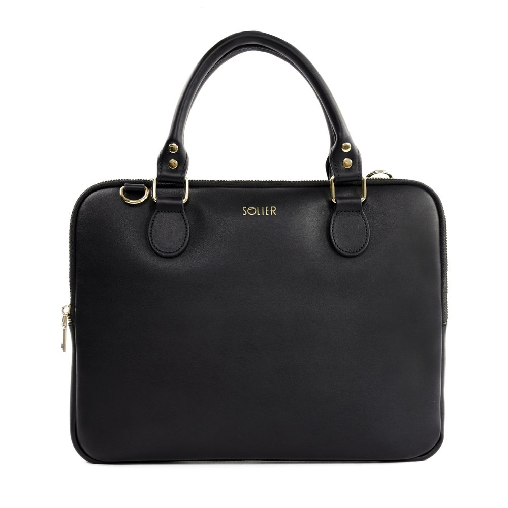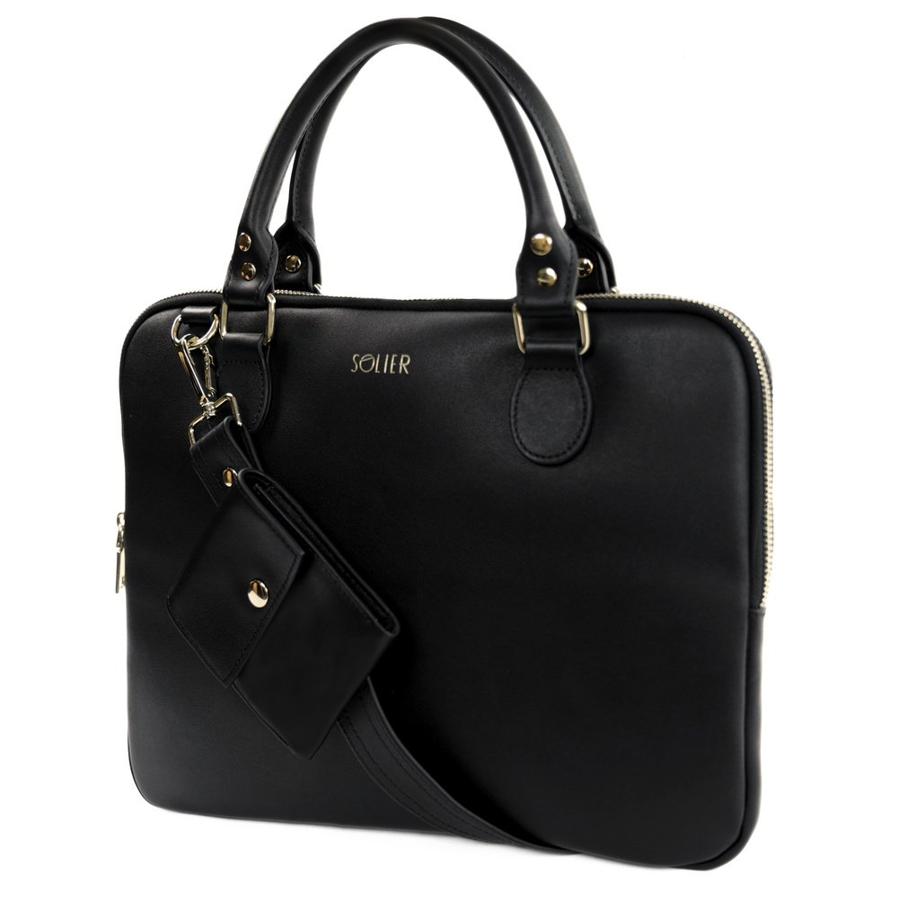 Juoda odinė moteriška kompiuterio rankinė Solier – stilingas ir praktiškas pasirinkimas darbui, studijoms ar kelionėms. Telpa iki 13,3 nešiojamas kompiuteris.