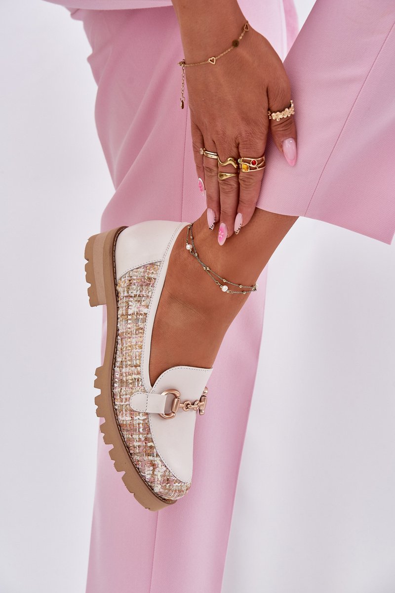 Odiniai šviesiai smėlio spalvos moteriški mokasinai su auksine detale