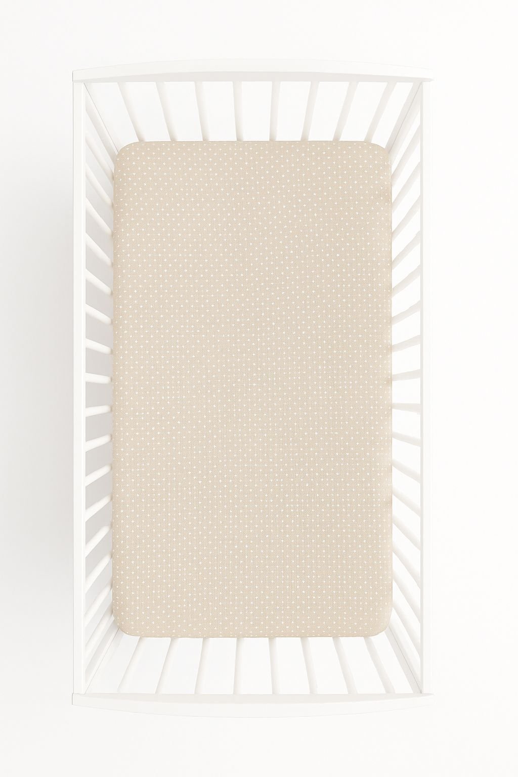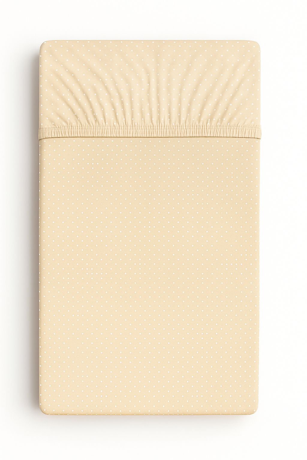 Medvilninė paklodė kūdikiui su guma – idealiai tinka 120x60 cm lovytei. Švelni smėlio spalva su baltais taškeliais suteikia jaukumo ir ramybės mažylio miegui.