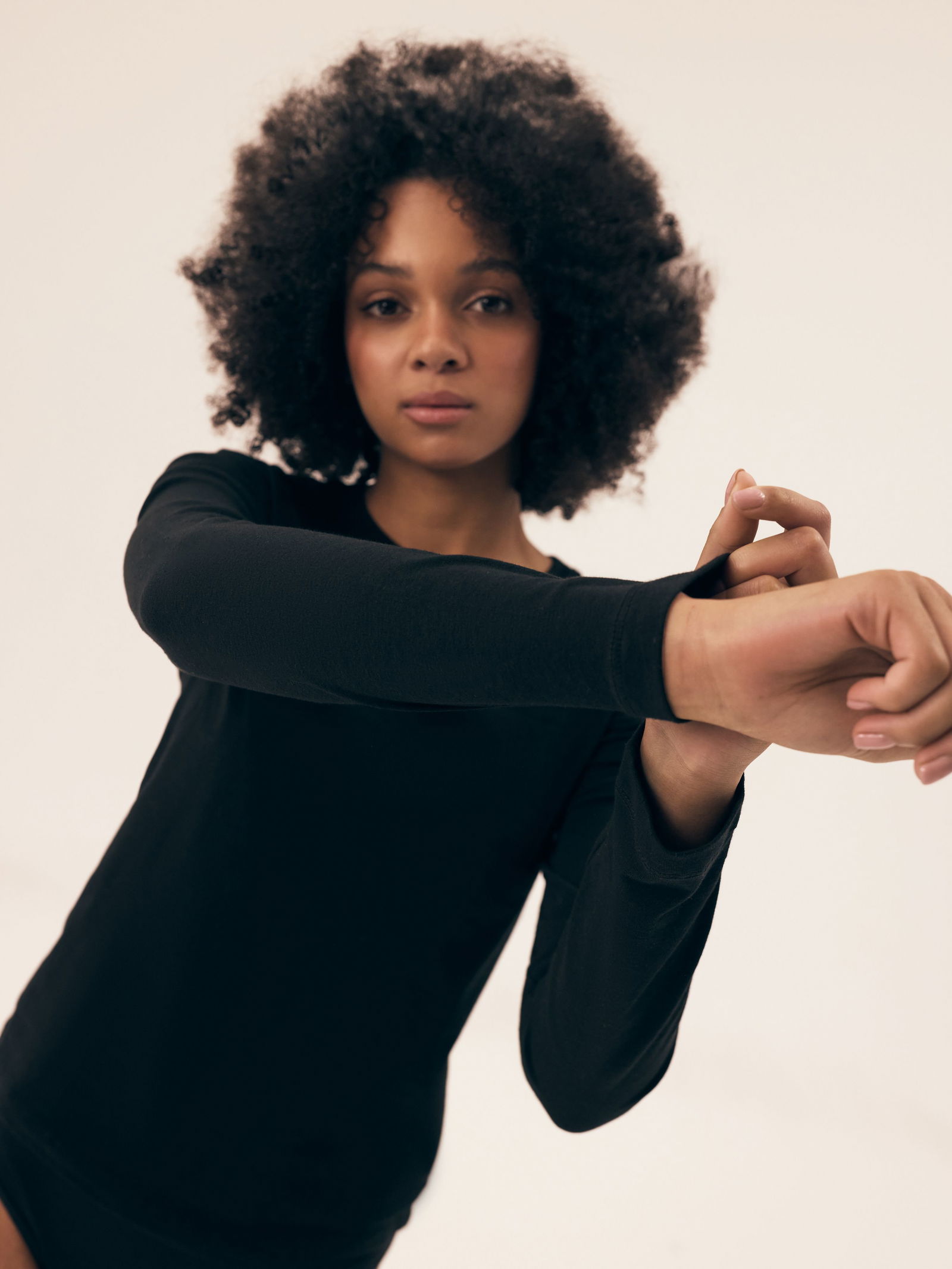 Klasikinė juoda spalva, ilgos rankovės ir pusapvalis kaklo iškirpimas. Palaidinė be raštų, tad lengvai derinama su įvairiais drabužiais. Glotni medžiaga suteikia elegantišką paprastumą.