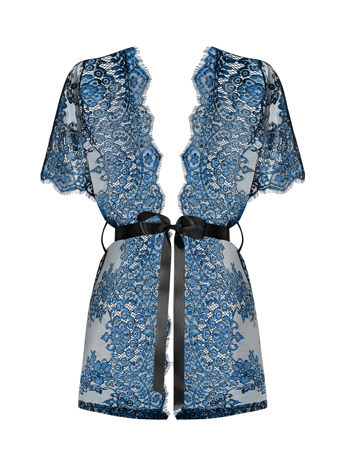 Išskirtinai gražus nėriniuotas peniuaras. Trumpesnis ir patogus. Padengtas stilingu elektrinės mėlynos spalvos gėlių raštu. Per liemenį surišamas juodu atlasiniu kaspinu. Dėvėkite jį ant nuogo kūno arba derinkite prie komplekto - bet kuriuo atveju atrodysite nežemiškai gundančiai. Sudėtis Sudėtis 90 % poliamidas, 10 % elastanas.