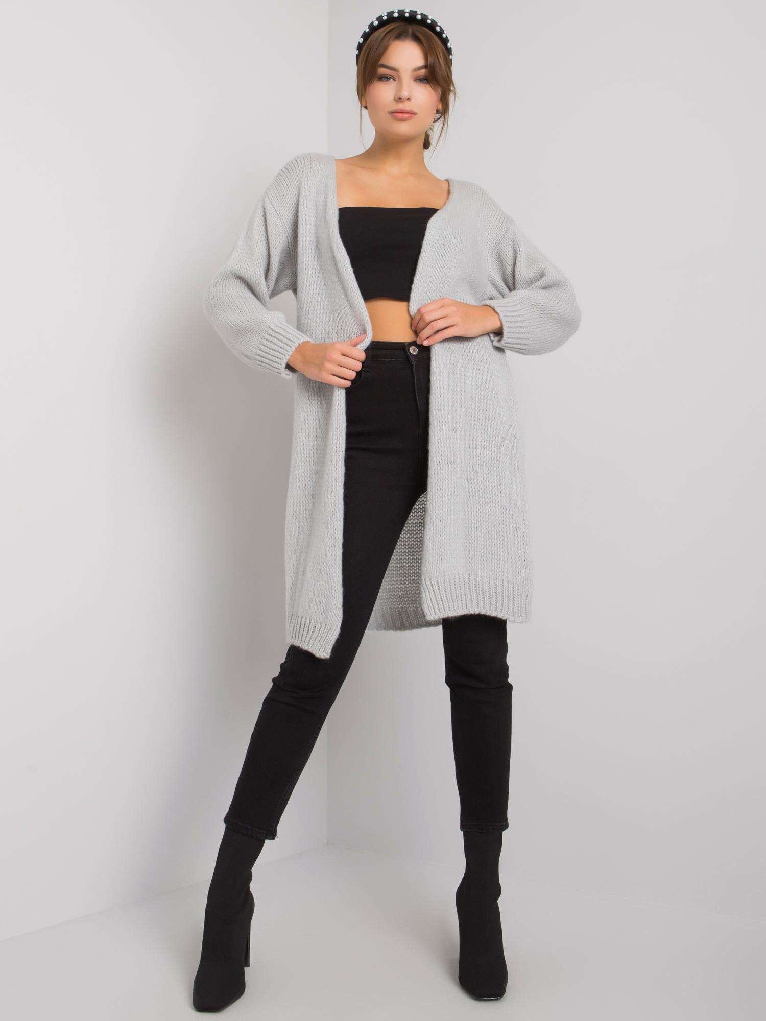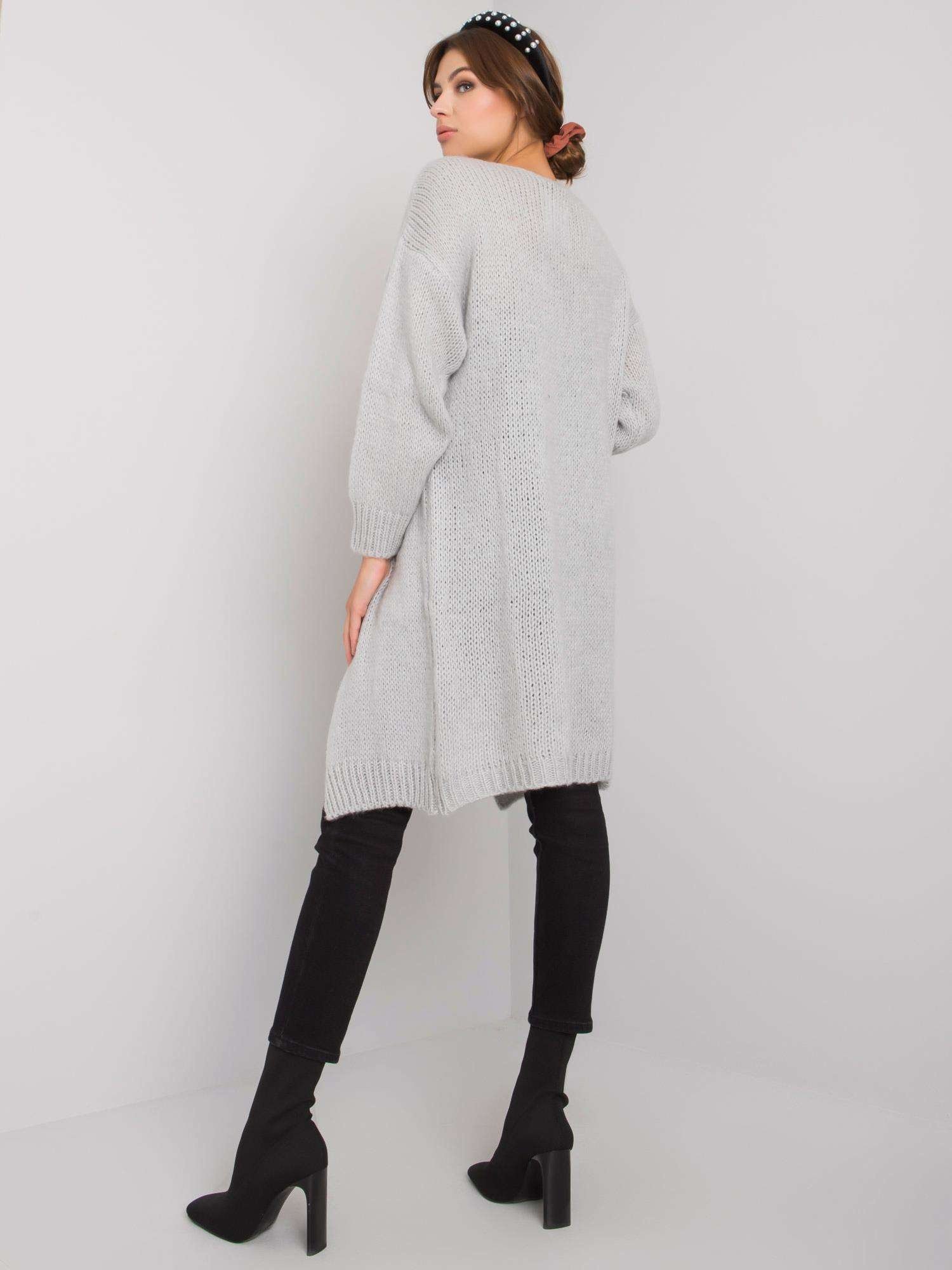 Vieno dydžio megztinio išmatavimai, matuojant lygiai: plotis po pažastimis - 49 cm, bendras ilgis - 90 cm, rankovių ilgis - 48 cm.