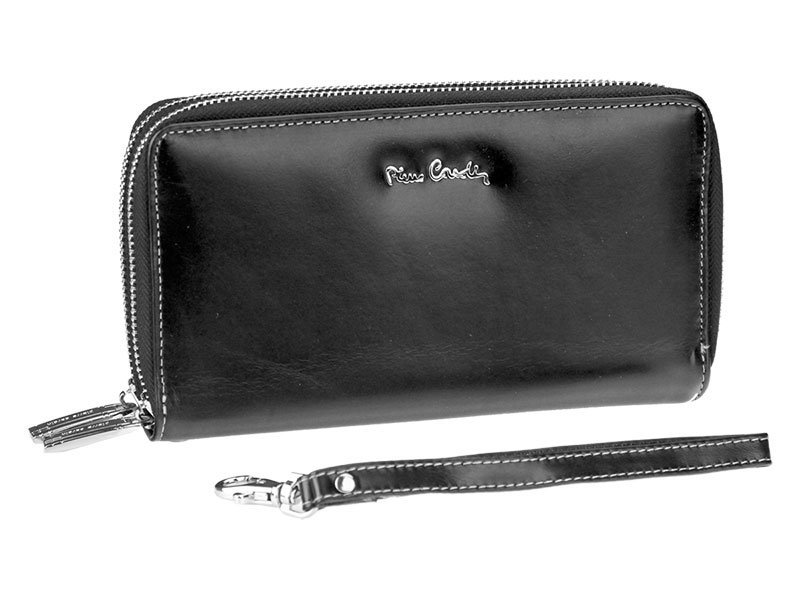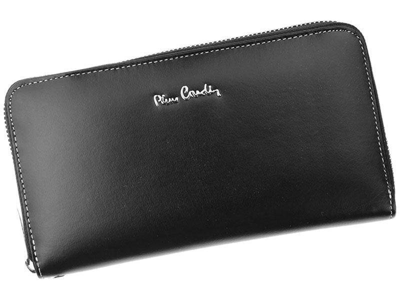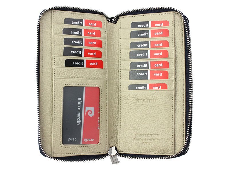 Moteriška piniginė iš natūralios odos Pierre Cardin, matmenys 20 × 11 × 4 cm. Dydis ir medžiaga tinka kasdieniams pinigams ir kortelėms.