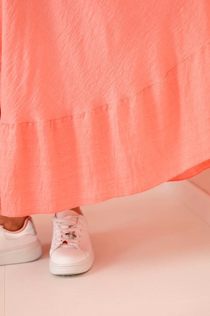 Suknelės rožinė spalva spinduliuoja švelnumu ir pozityvumu. Raukiniai suteikia žaismingumo, o V formos iškirptė prideda elegancijos. Tai modelis, kuris dera tiek prie kasdienio įvaizdžio su sportbačiais ar espadrilėmis, tiek prie šventinio derinio su aukštakulniais bei rankine. Suknelė padeda išreikšti moteriškumą neatsisakant komforto.