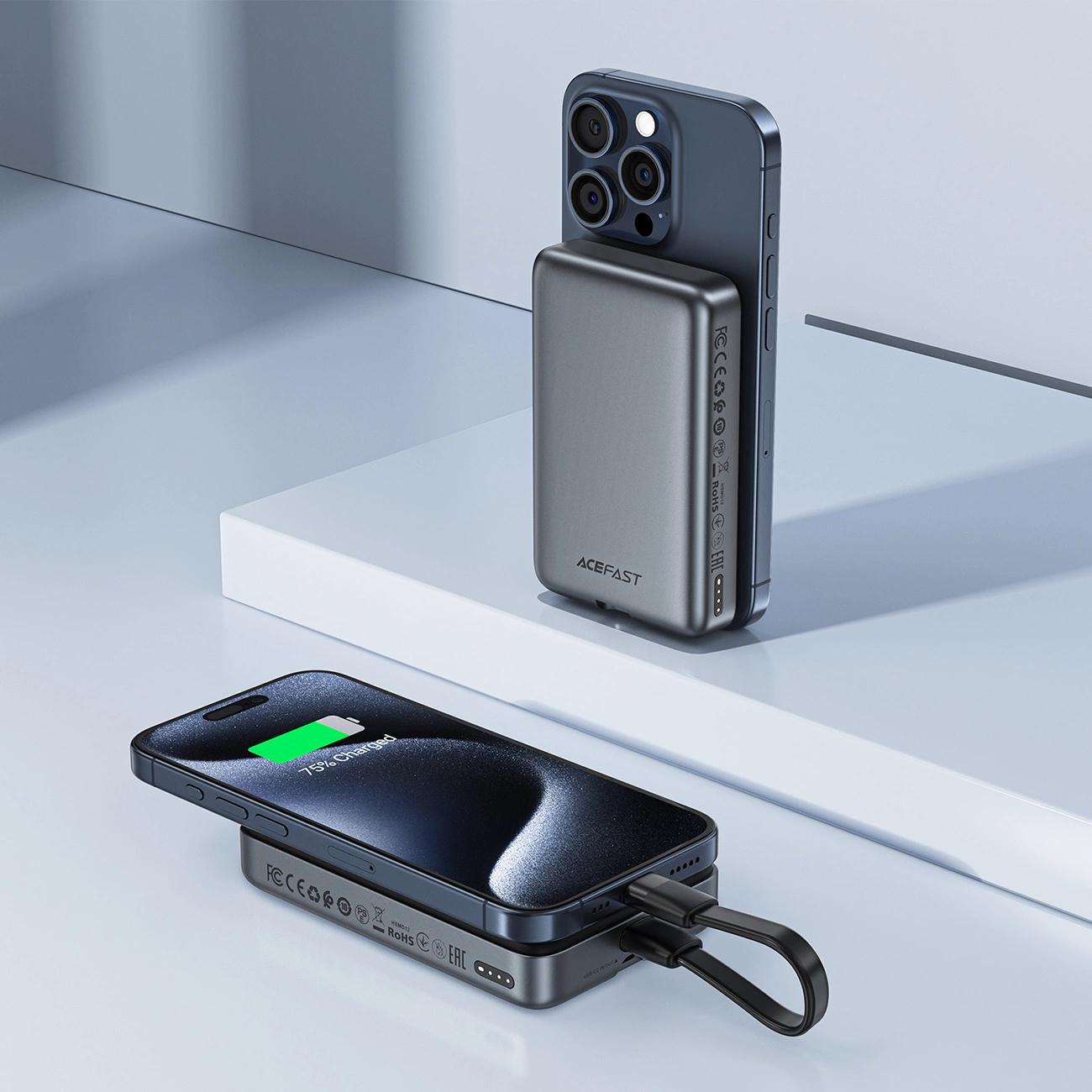 Acefast M10 magnetinis nešiojamasis įkroviklis su 2 USB C kabelis, kuris padidina naudojimo patogumą. Didelė baterijos talpa ir patvarumas