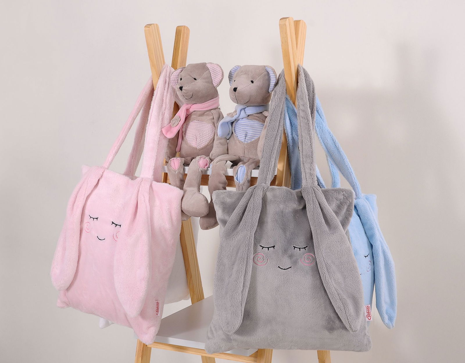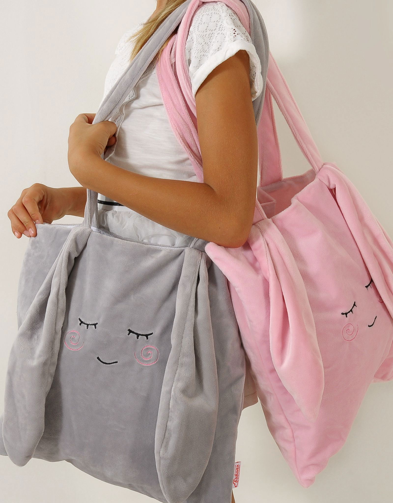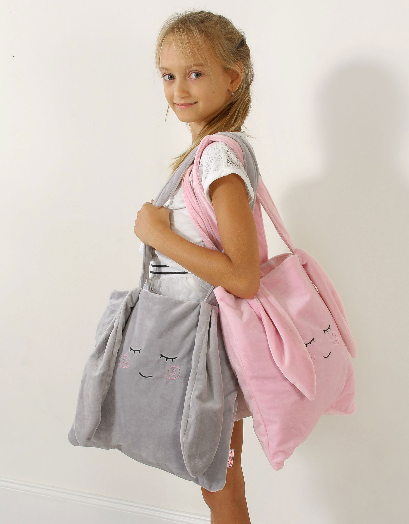 Vaikiška pilka rankinė su kiškio ausytėmis – žaismingas ir švelnus stiliaus akcentas mažiesiems