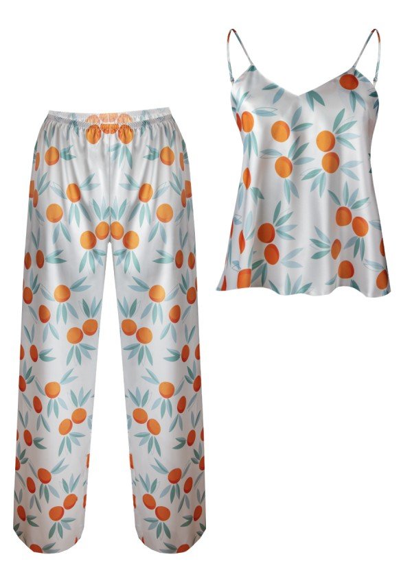 Patogus, du -pižama iš minkšto, marginto atlaso. Skirta pabrėžti krūtinės liniją, žavi subtilia iškirpte ir gražiais, plonais petnešėlėmis, kurių ilgį galima reguliuoti. Ilgos kelnės patogiomis kojomis, minkštu elastiniu juosmeniu. Sudėtis 100 % poliesteris.