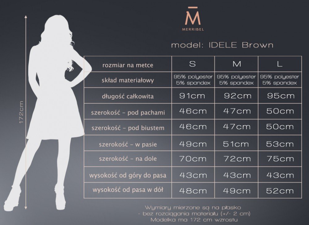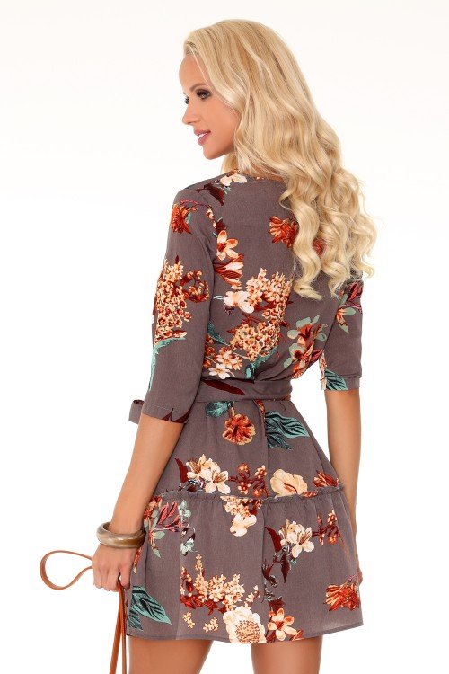 Patogi, puikiai tinkanti vasarai, šviesiai ruda suknelė su gražiomis, subtiliomis gėlėmis. Modelis su apvalia, subtilia iškirpte, rankovėmis iki alkūnių, juosmenį pabrėžiančiu segtuku ir laisva, erdvia apačia, puošta raukinukais. Tai modelis su kuriuo tikrai jausitės gražiai, moteriškai ir patogiai.