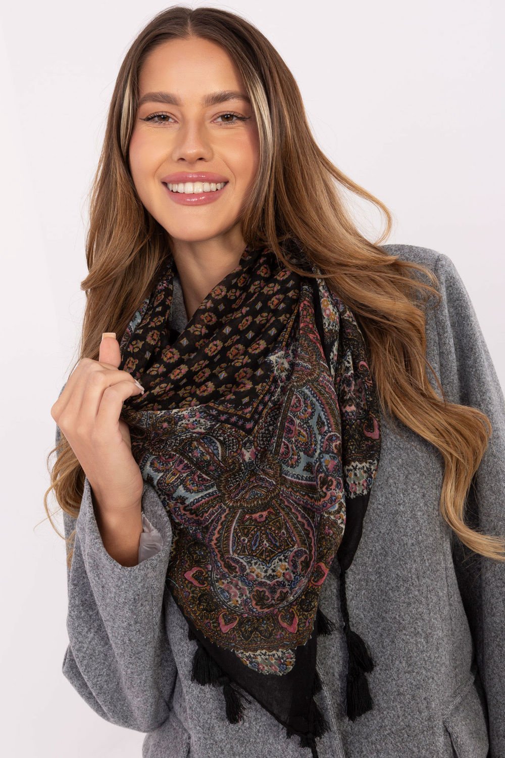 Kvadratinis šalikėlis su kutais ir raštu – universalus pasirinkimas