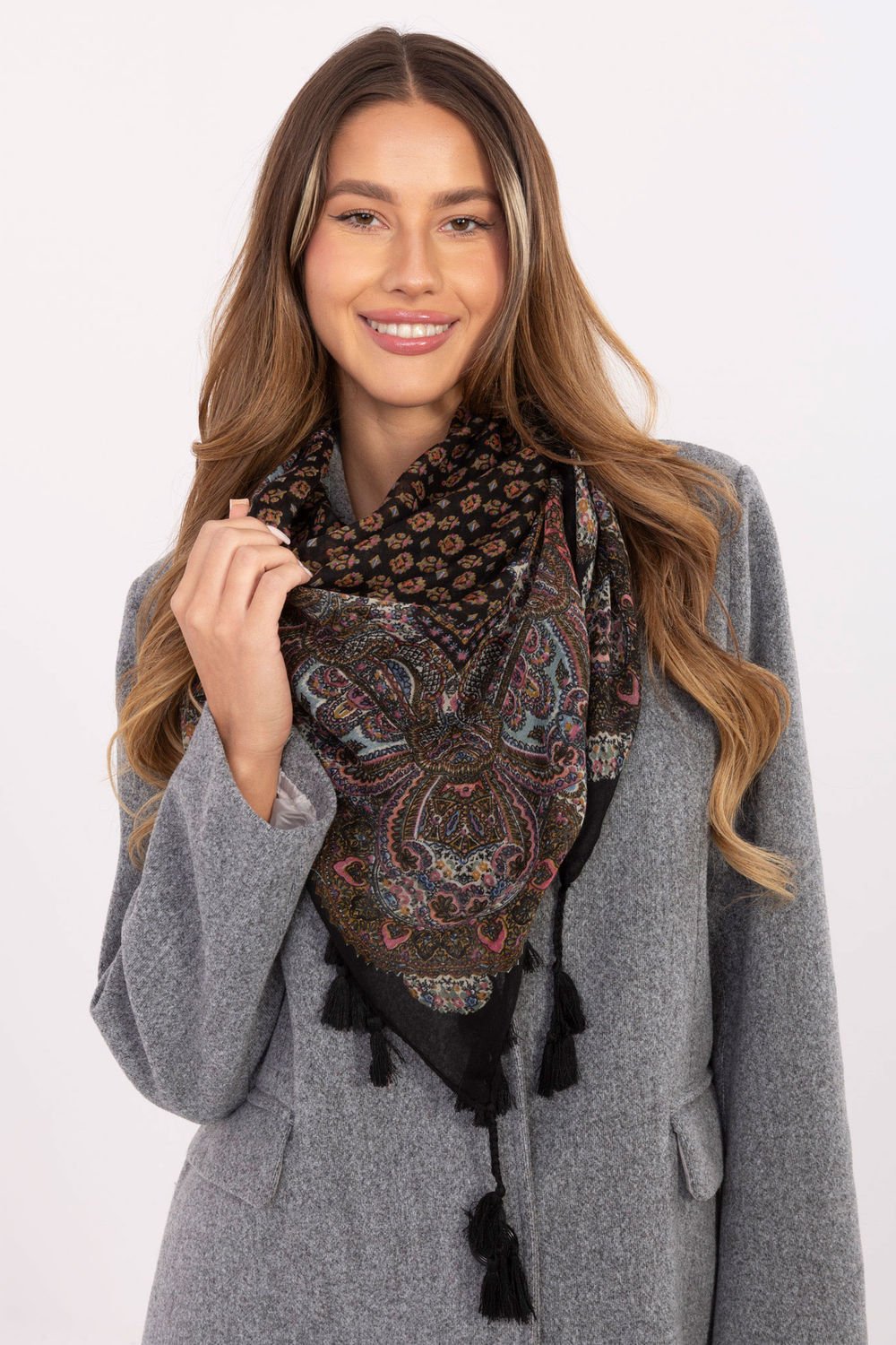 Stilingas kvadratinis šalikėlis – tai universalus aksesuaras, suteikiantis išskirtinumo bet kokiai aprangai. Akį traukiantis raštas ir kutų apdaila suteikia jam lengvumo bei subtilų boho stilių. 110 × 110 cm dydis leidžia šalikėlį nešioti įvairiais būdais: ant kaklo, pečių, kaip šaliką ar net kaip rankinės puošmeną.