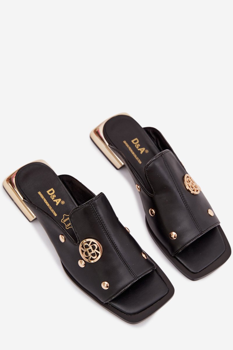 Moteriškos šlepetės iš natūralios odos – juodos su auksinėmis detalėmis, turinčios plačius kvadratinius priekus ir žemą, plokščią kulniuką, tinkamos šiltam sezonui bei derinimui prie kasdienių ir išėjiminių derinių.