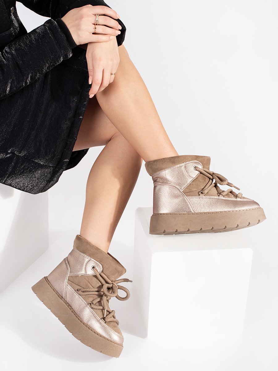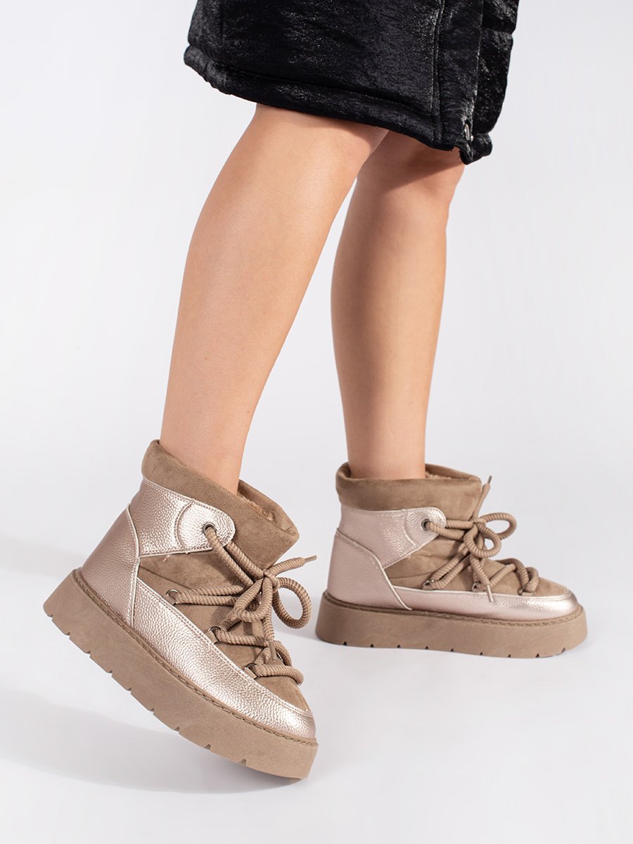 Smėlinės spalvos moteriški suvarstomi sniego batai storu padu
