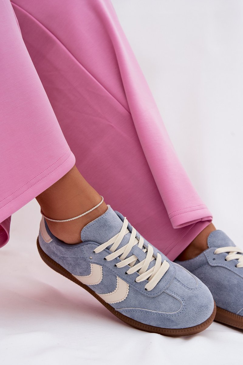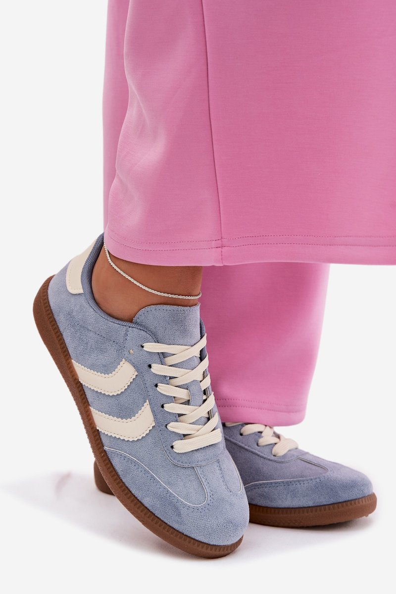 Moteriški sportbačiai iš dirbtinės zomšos – žemo profilio, mėlyni, pritaikyti patogiam ėjimui mieste. Klasikinis raištelinis užsegimas leidžia tiksliai susireguliuoti prigludimą. Dekoratyvios šoninės juostelės paryškina siluetą ir suteikia modernesnį akcentą kasdieniam įvaizdžiui.