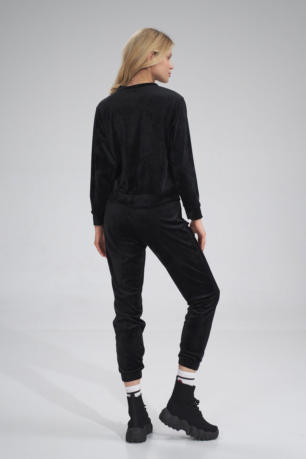 Velūro sportinės kelnės be kišenių, ties juosmeniu ir apačia - plati guma.