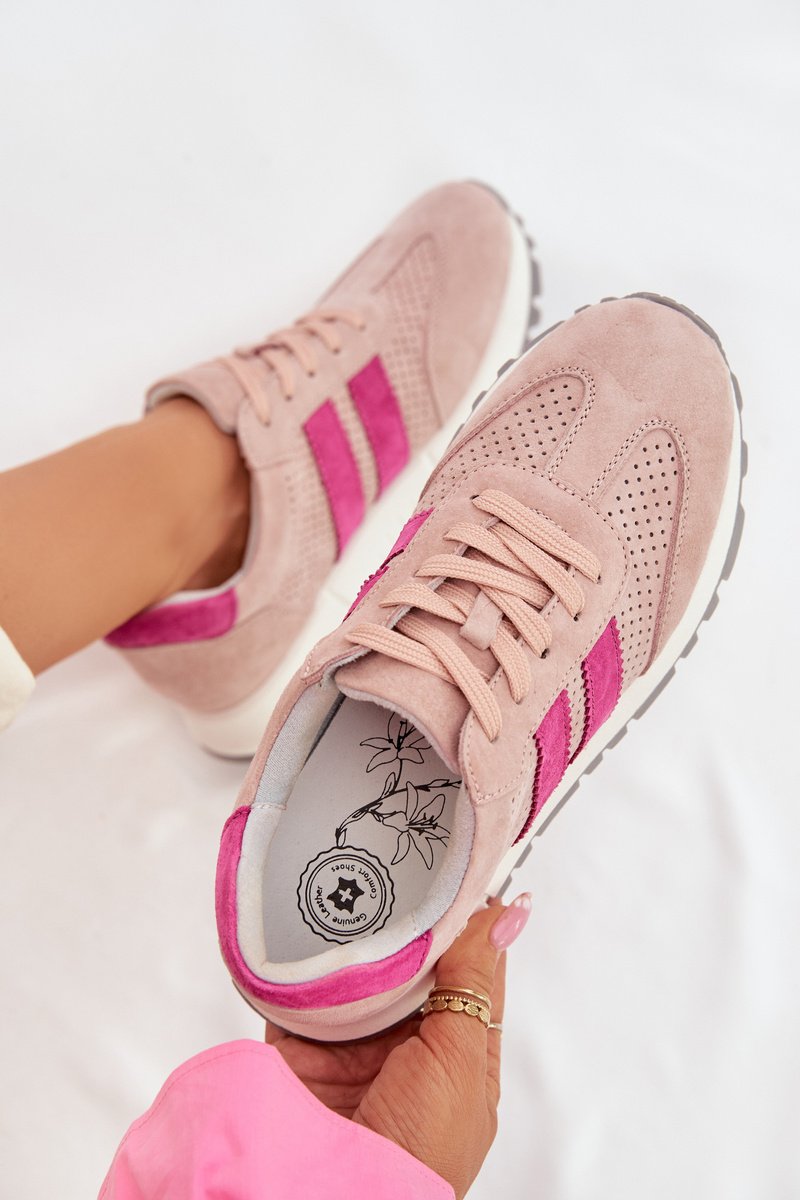 Sportiniai batai moterims iš natūralaus zomšo, rožiniai turi dvi matomas juostas šonuose ir neutralią, lygų viršutinę dalį. Viduje yra odinė, minkšta įdėklė, suteikianti komfortą ilgiau nešiojant. Gaminių konstrukcija orientuota į kasdienį laisvalaikį ir paprastą derinimą su kitais drabužiais.