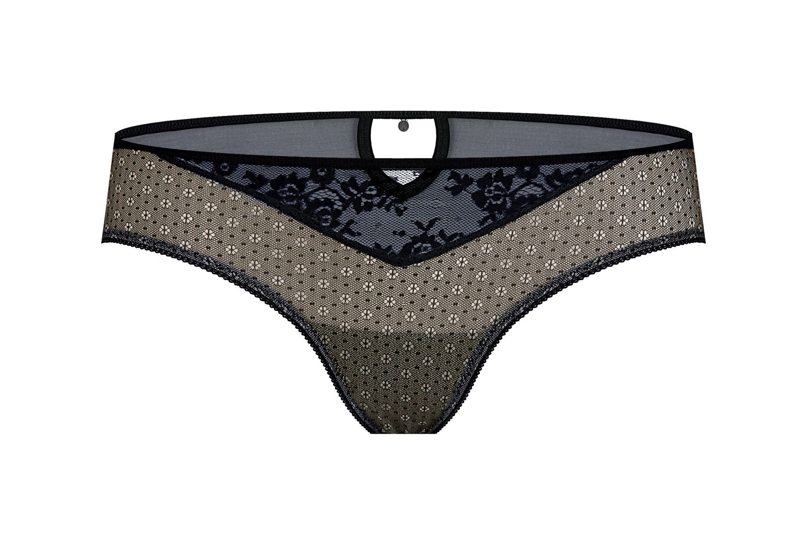 Jausmingi dirželiai, viliojantys aukštu, gražiu cirkoniu nugaroje. Juodos ir tamsiai smėlio spalvos, kurios kartu sukuria įspūdingą efektą. Nedidelis, gėlių raštas ant audinio. Įstrižas pusiau permatomų nėrinių ir trikotažo derinys optiškai lieknina kūną.