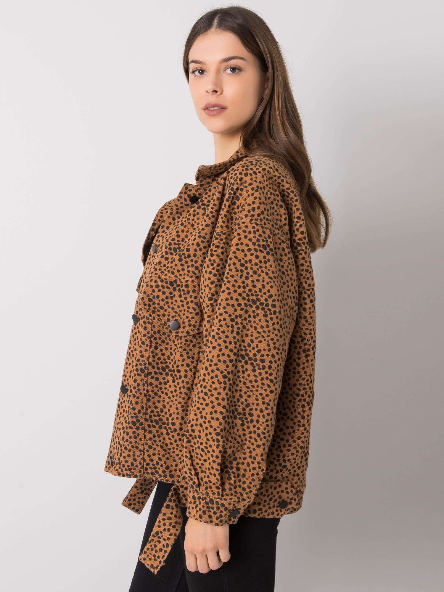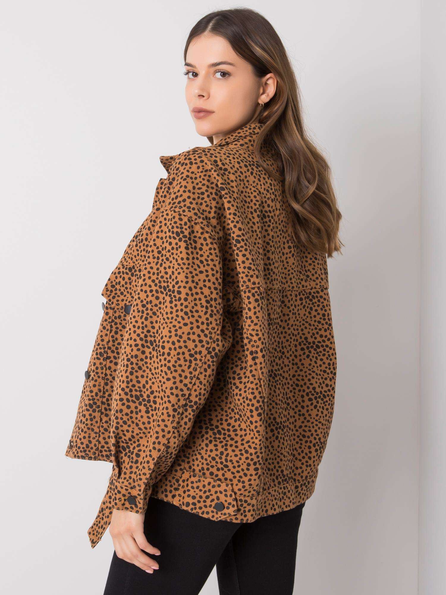 Šviesiai ruda džinsinė striukė su raštais.