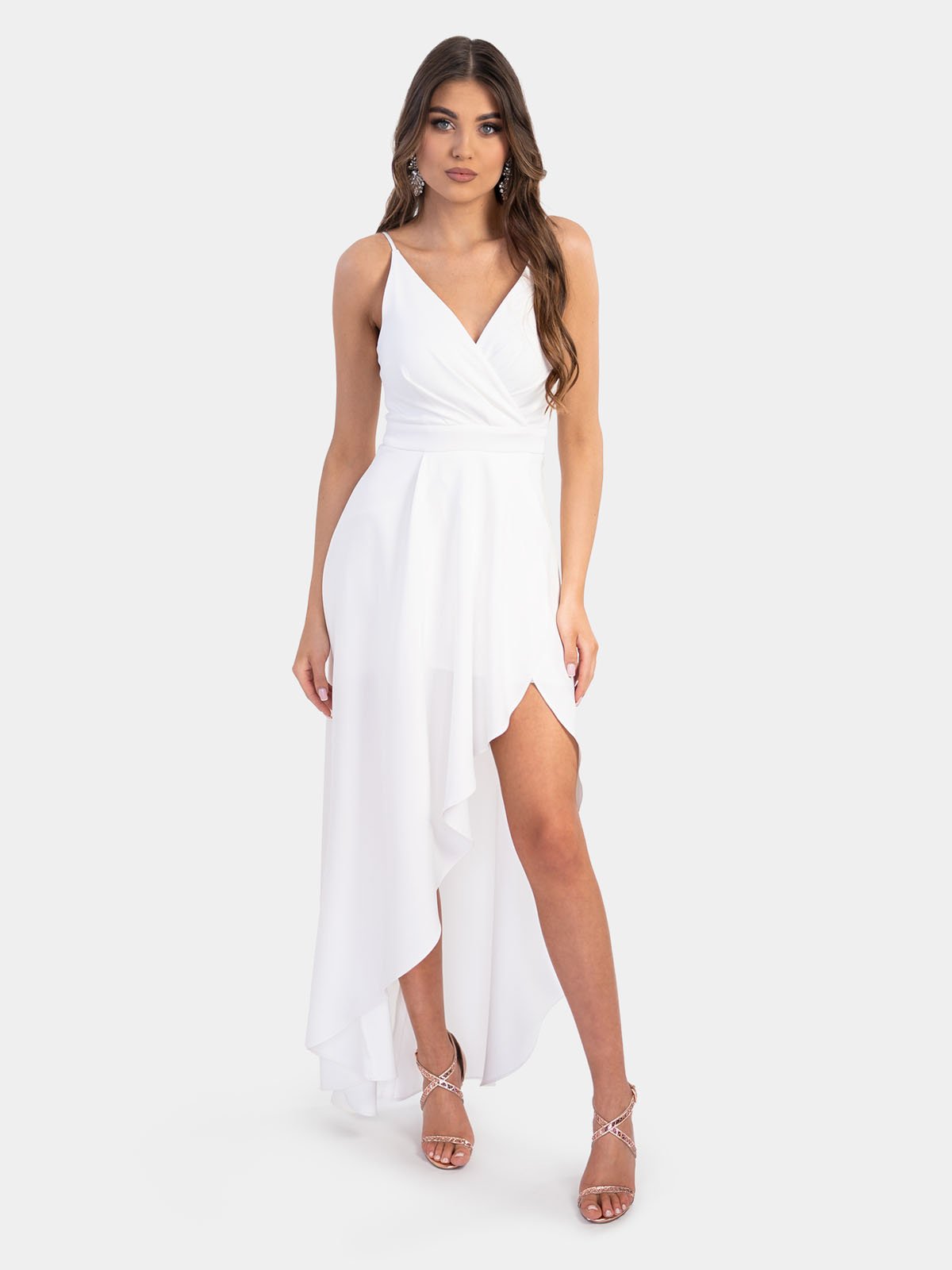 Ilga balta vakarinė suknelė moterims – tobulas pasirinkimas ypatingoms progoms. Asimetriškas kirpimas ir subtilus blizgesys kuria išskirtinį įvaizdį.
