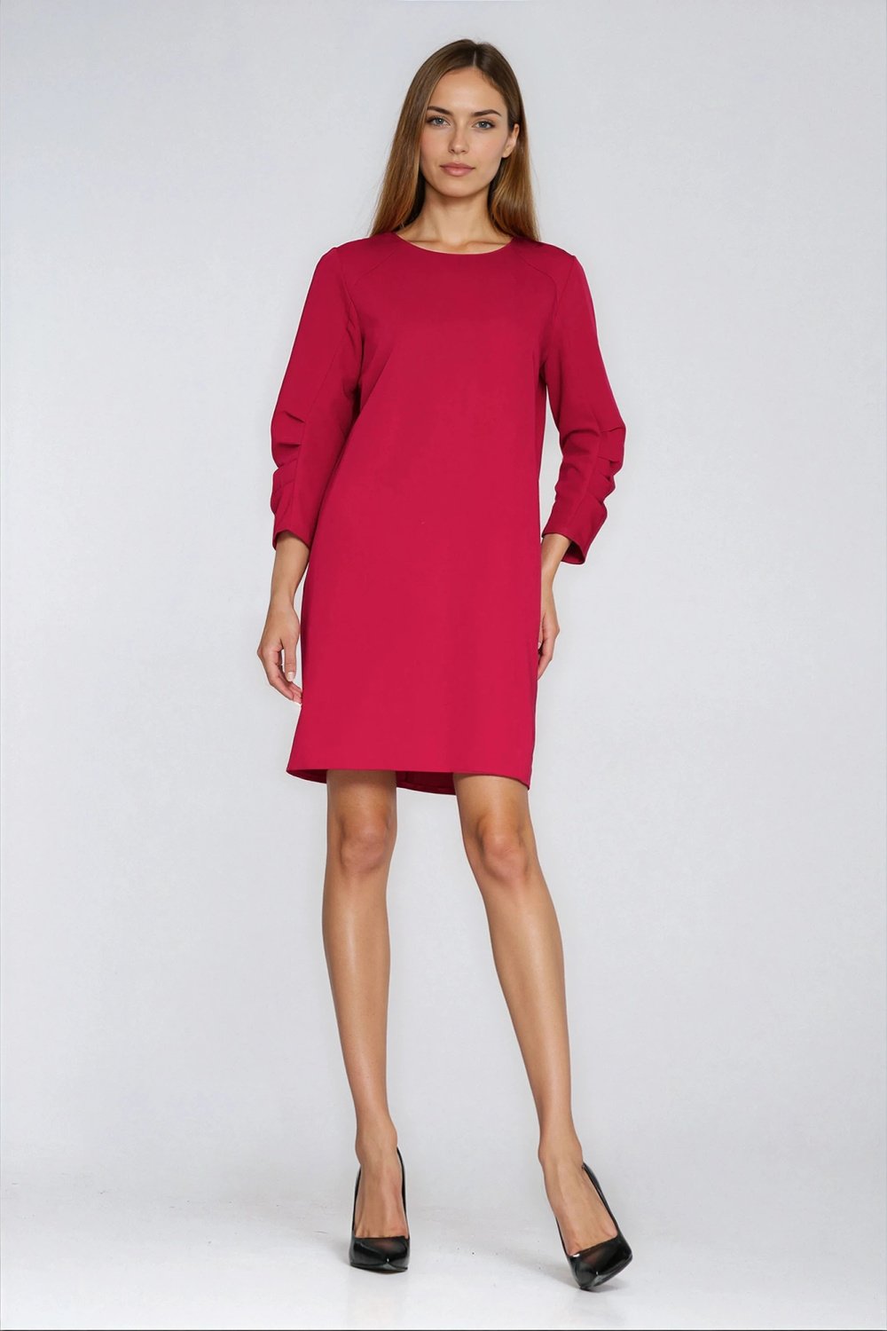 Elegantiška suknelė su A formos siluetu puikiai tinka tiek kasdieniam dėvėjimui, tiek pusiau formalioms progoms. Apvali iškirptė ir 3/4 ilgio rankovės su klostėmis suteikia išskirtinumo, o paslėptas užtrauktukas nugaroje užtikrina patogų dėvėjimą. Suknelės ilgis iki kelių leidžia ją lengvai derinti įvairiose situacijose.