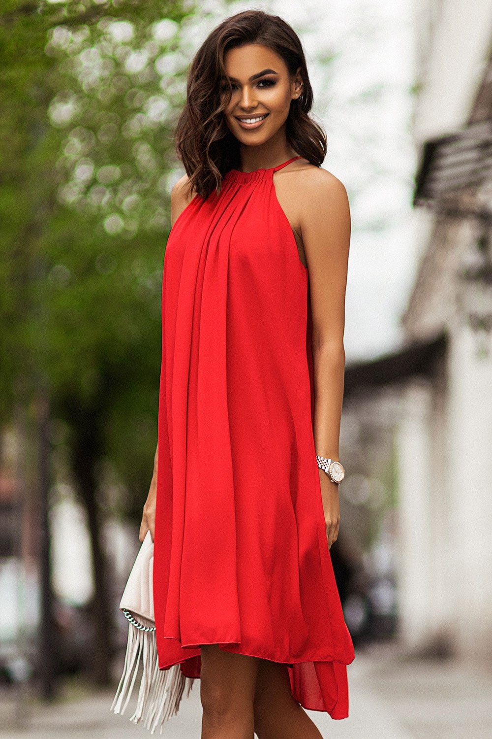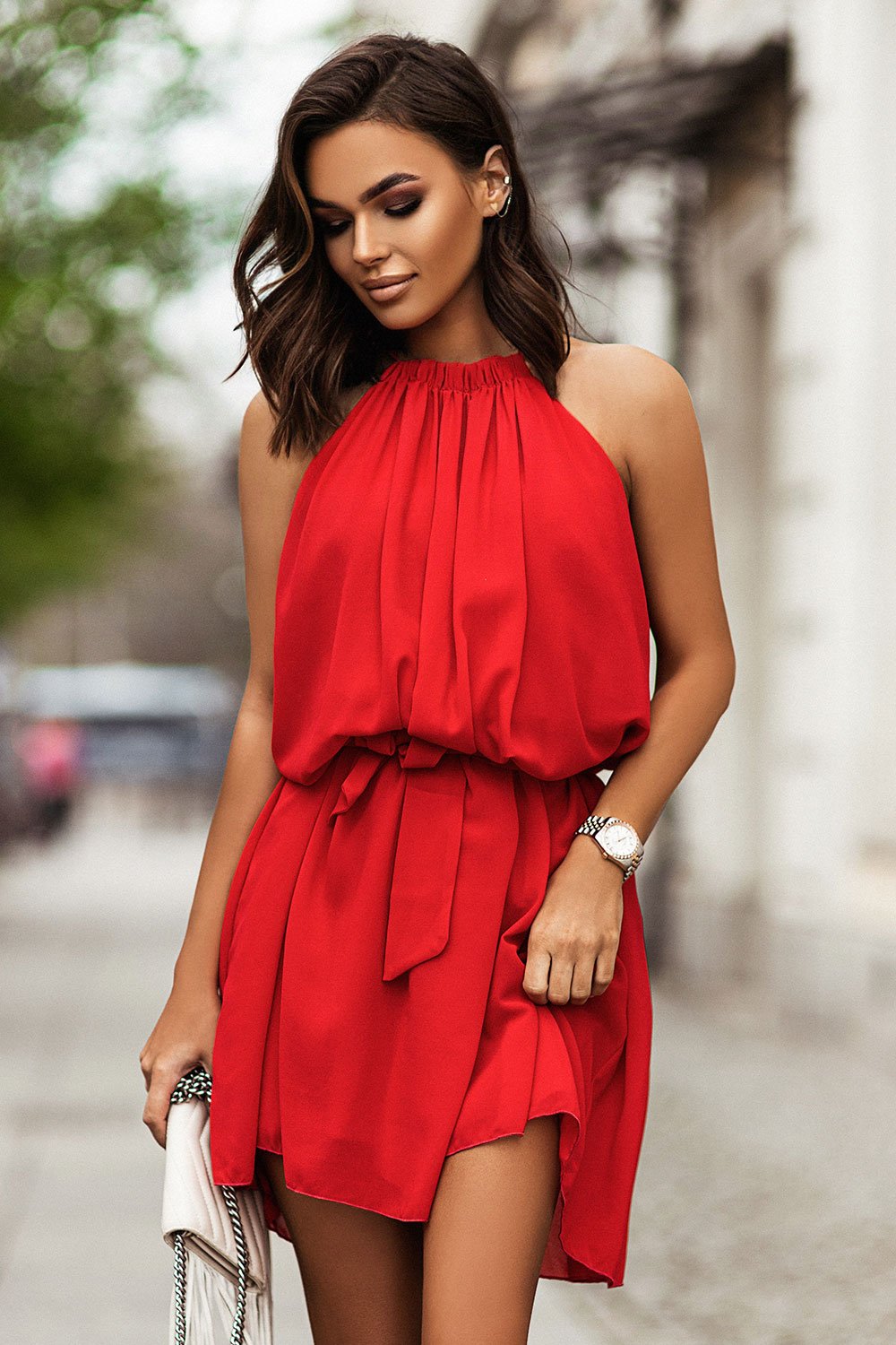 Ši šifoninė, švelni ir lengvai krintanti suknelė su kaklo tipo halter iškirpte puikiai tiks šventėms ir vasaros vakarams.