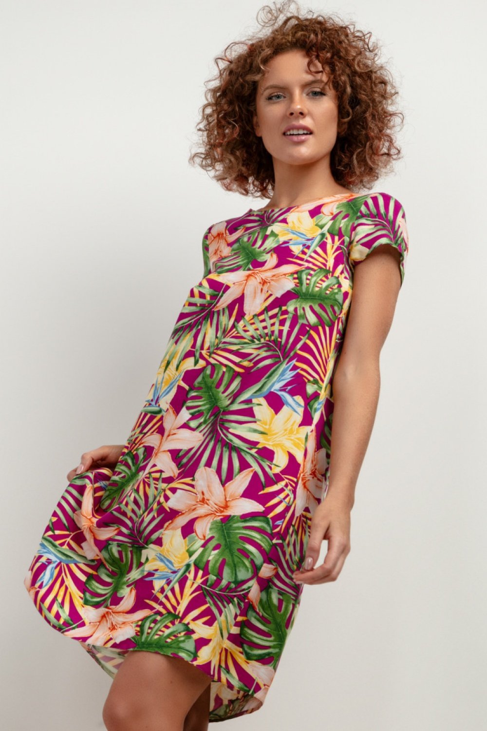 Moteriška suknelė iš viskozės su raštuotu audiniu – klasikinis kirpimas ir ilgis iki kelių, kurie pabrėžia siluetą ir suteikia patogumo kasdieniuose deriniuose. Kontrastinga siūlė nugaroje prideda originalios detalės, o audinys yra švelnus odai ir lengvai prižiūrimas. Suknelė tinka tiek susitikimams su draugais, tiek iškilmingesnėms progoms.