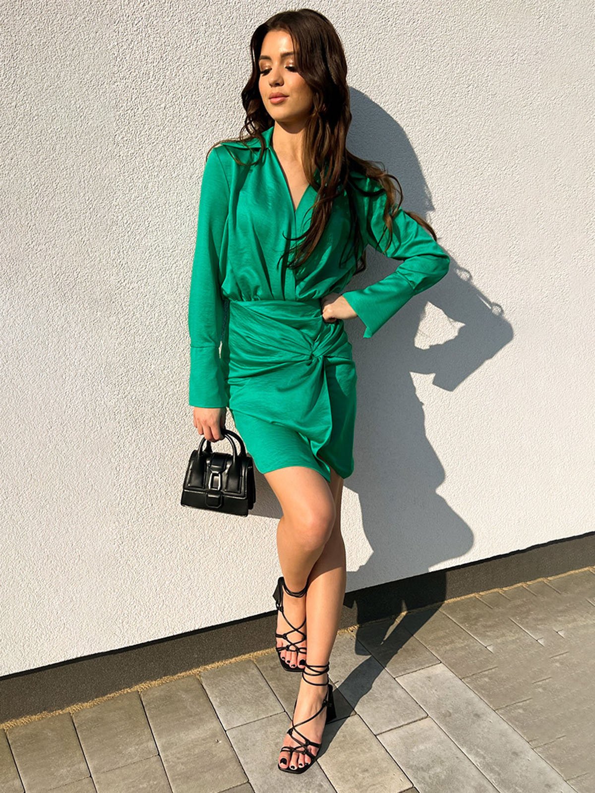 Ryškiai žalia spalva suteikia gaivumo įspūdį, o priekyje esantis raukinys kuria išskirtinį siluetą. Ilgos rankovės su marškinių tipo kirpimu prideda elegancijos, o atvira iškirptė subtiliai atskleidžia moteriškumą.