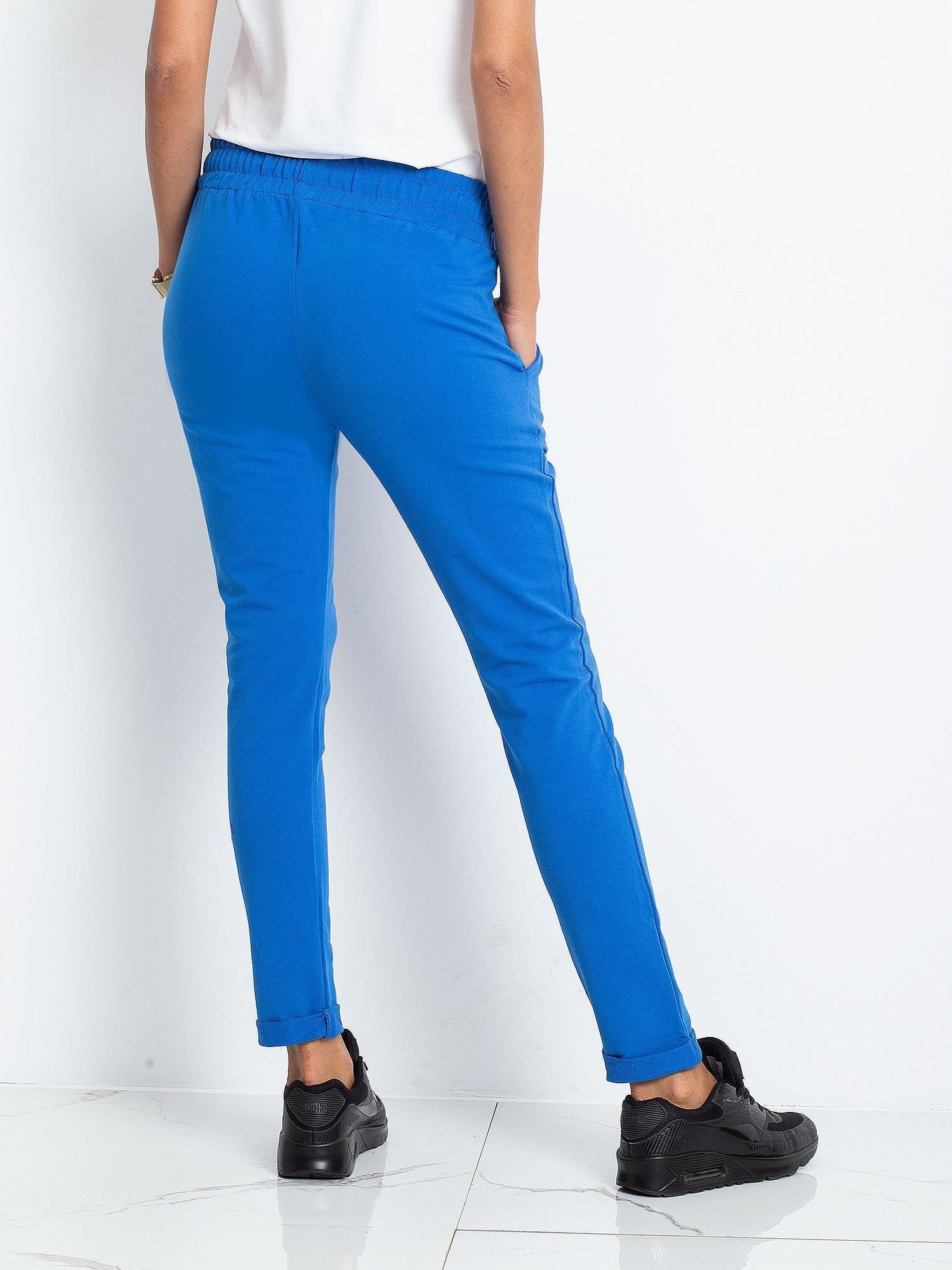 Mėlynos medvilninės moteriškos sportinės kelnės.