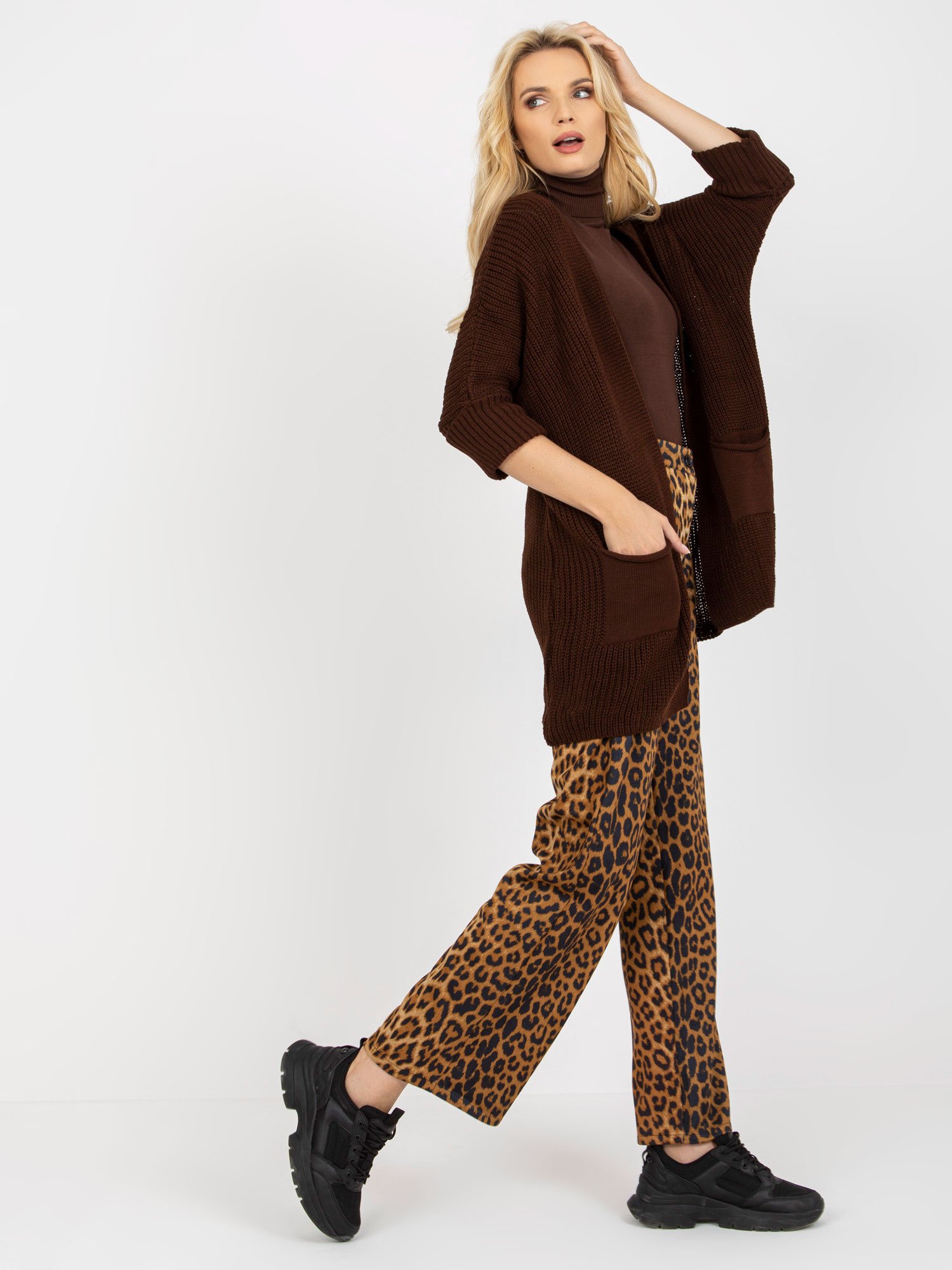 Modelis dėvi vieno dydžio drabužius. Modelio išmatavimai: ūgis 180 cm, krūtinė 90 cm, liemuo 63 cm, klubai 93 cm.