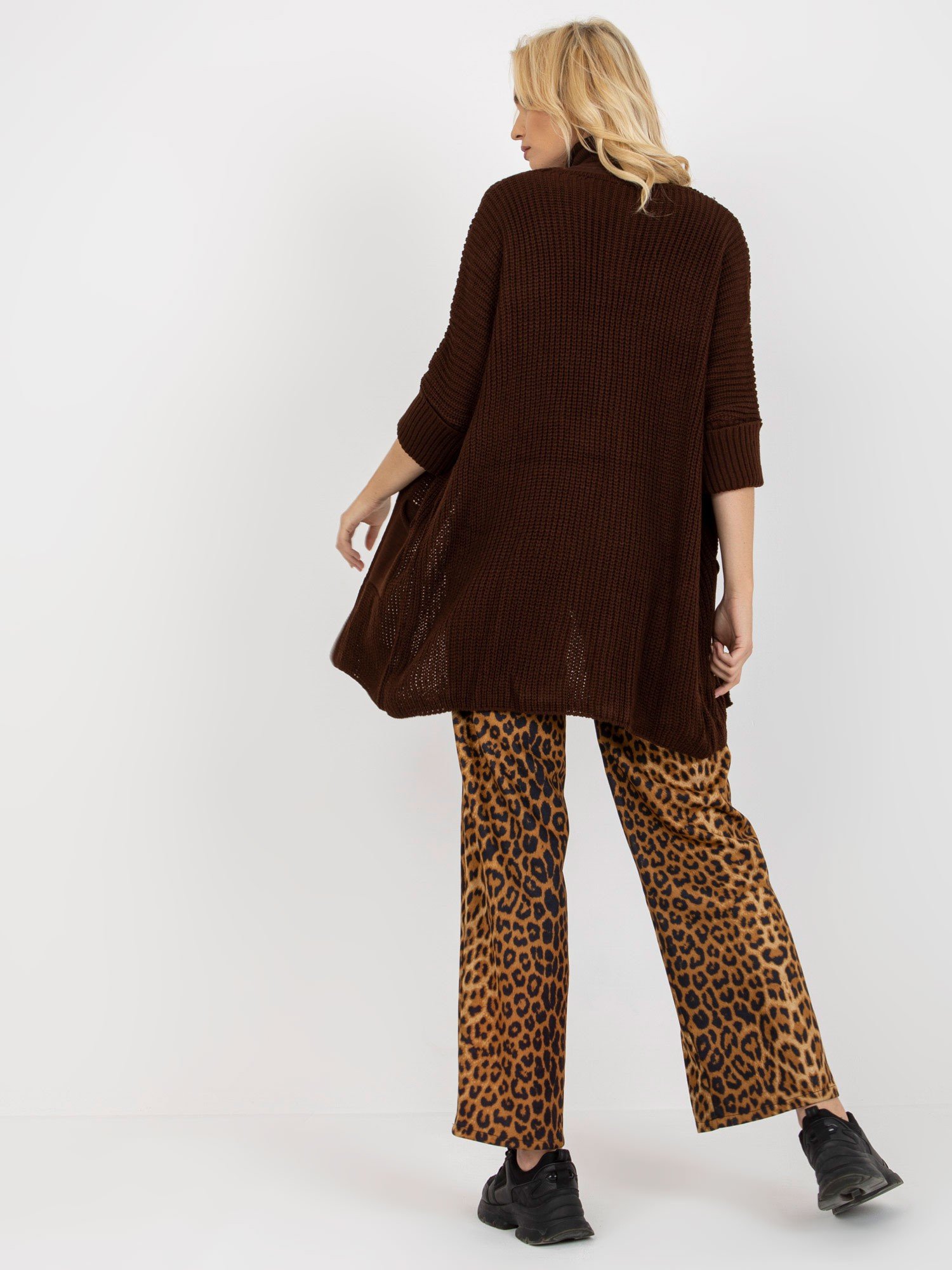 Vieno dydžio megztinio išmatavimai, matuojant lygiai: pažastų plotis - 65 cm, bendras ilgis - 78 cm, rankovių ilgis - 43 cm.